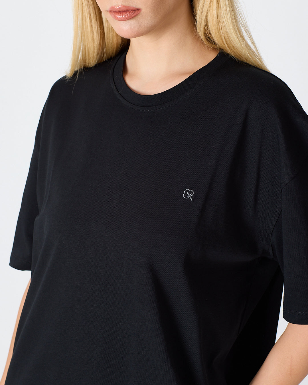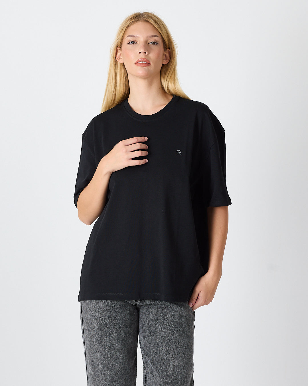 Siyah rengiyle her kombine uyum sağlayan bu unisex oversize tişört, göğüs kısmındaki gümüş renk nakış detay ile sade şıklığı modern bir dokunuşla birleştiriyor. Geniş kesimi sayesinde gün boyu rahatlık sunar; günlük stilinizden sokak modasına kadar her tarza kolayca adapte olur.