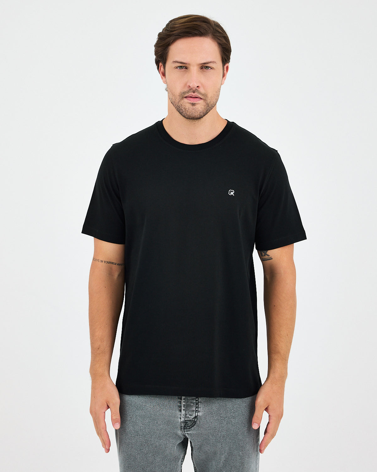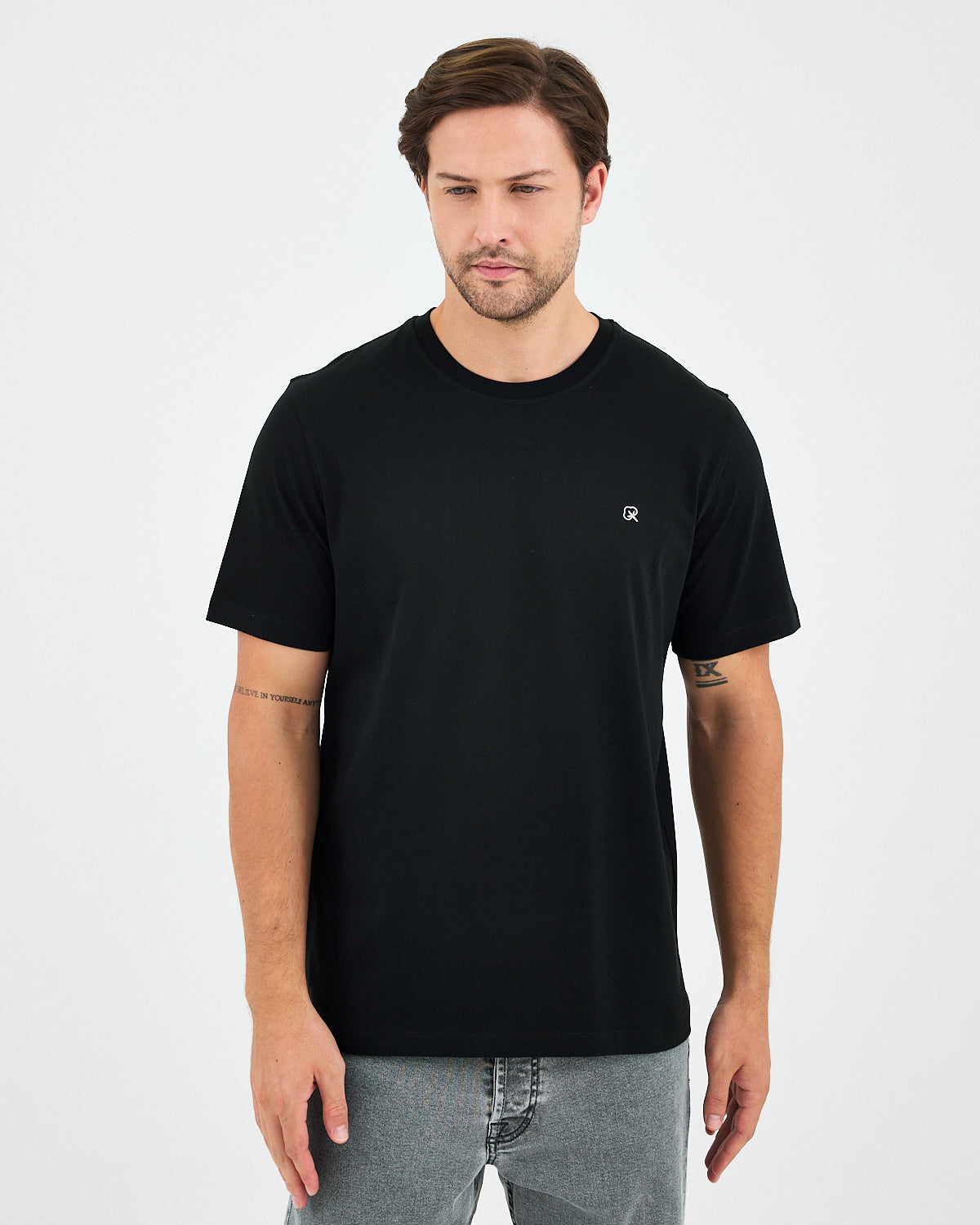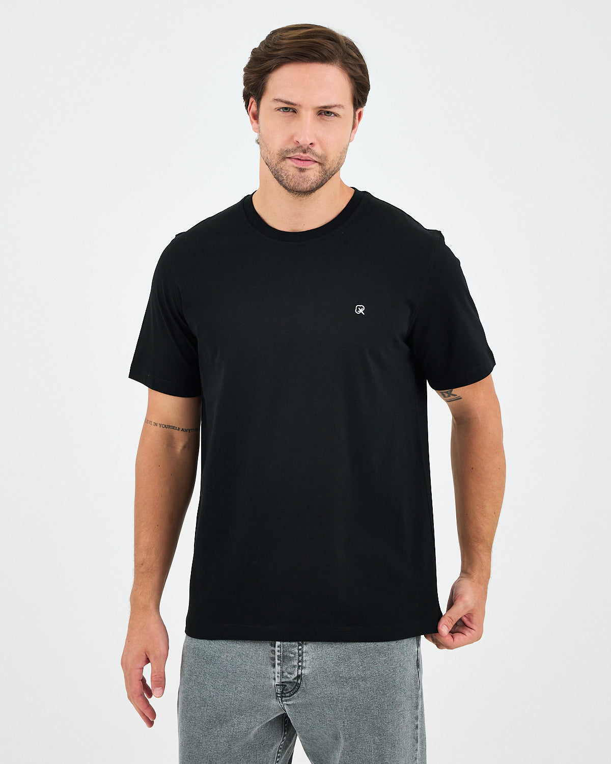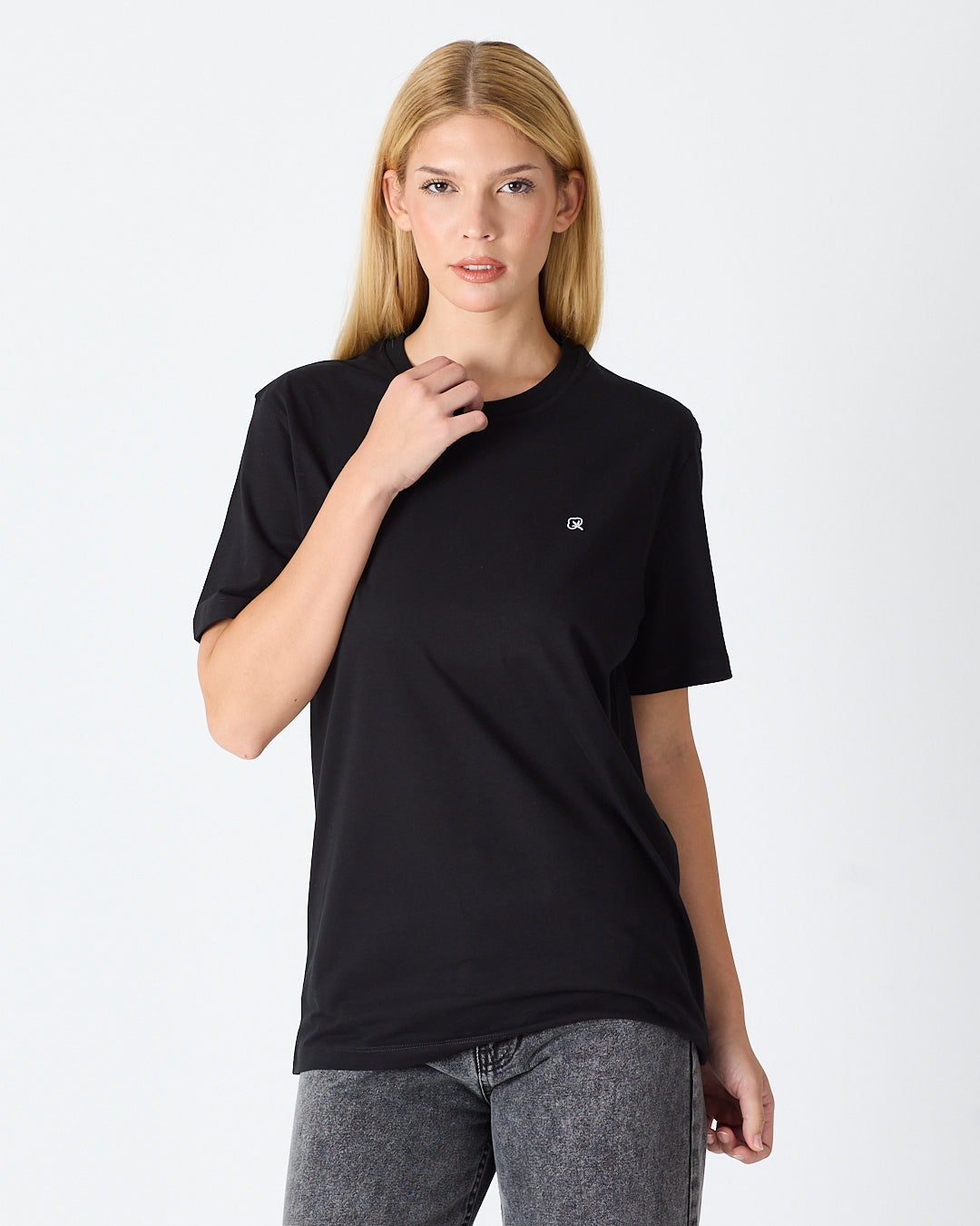 Siyah rengiyle zamansız ve sade bir stil sunan bu unisex tişört, göğüs kısmındaki  beyaz nakışlı logo detayıyla modern ve dikkat çekici bir görünüm kazandırır. Rahat kesimi ve yumuşak dokusuyla gün boyu konfor sağlar; günlük kombinlerden spor görünümlere kadar her tarza uyum sağlar.