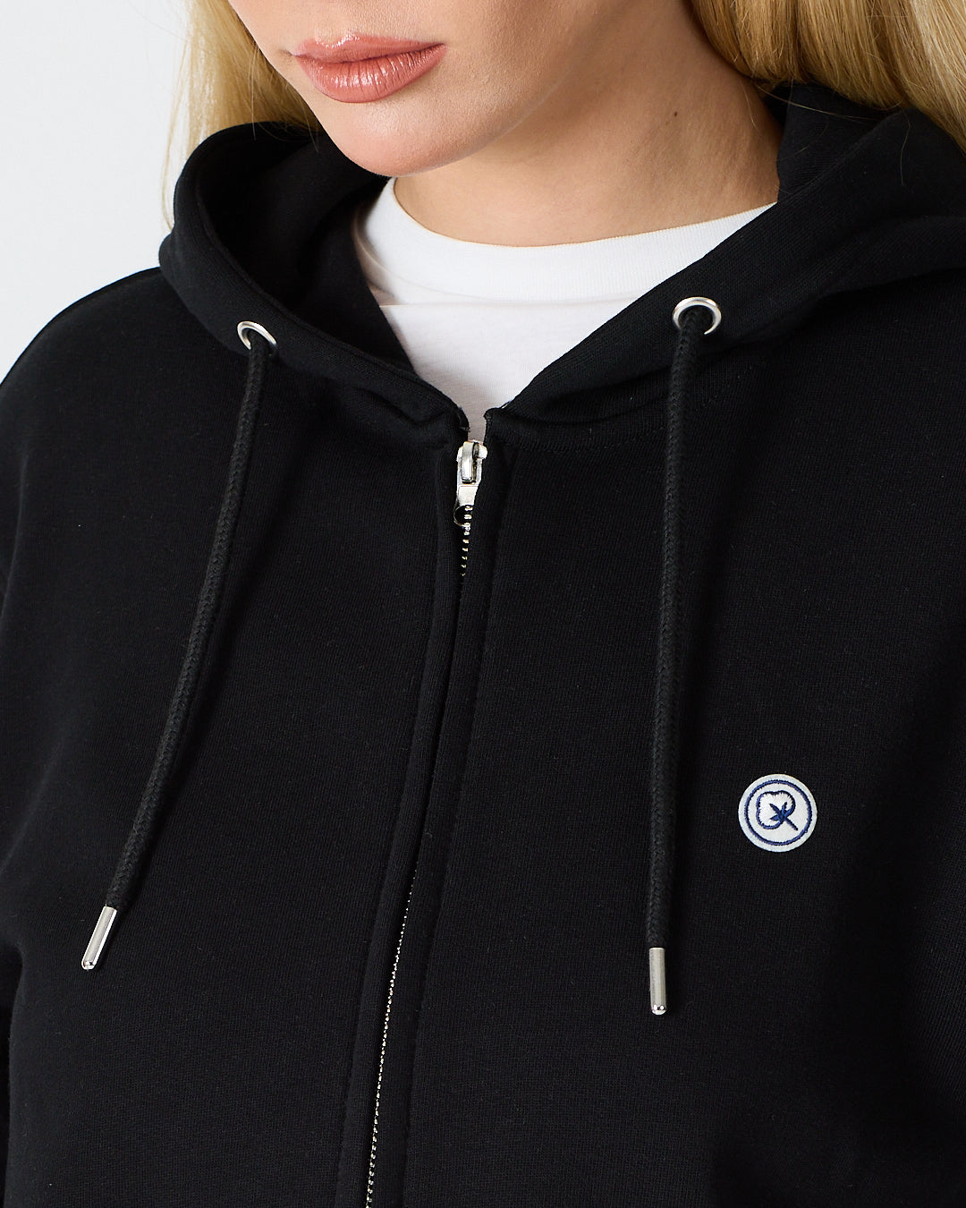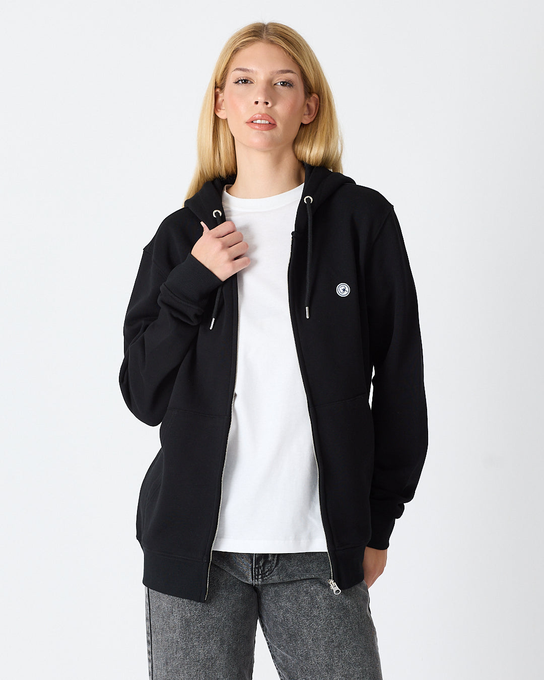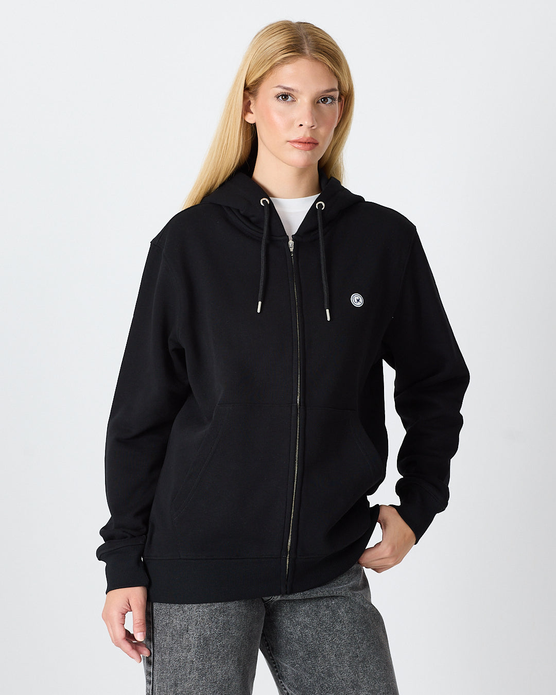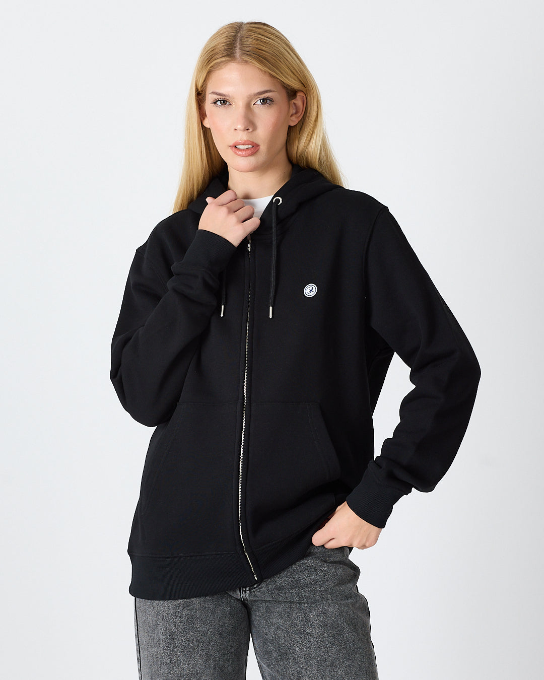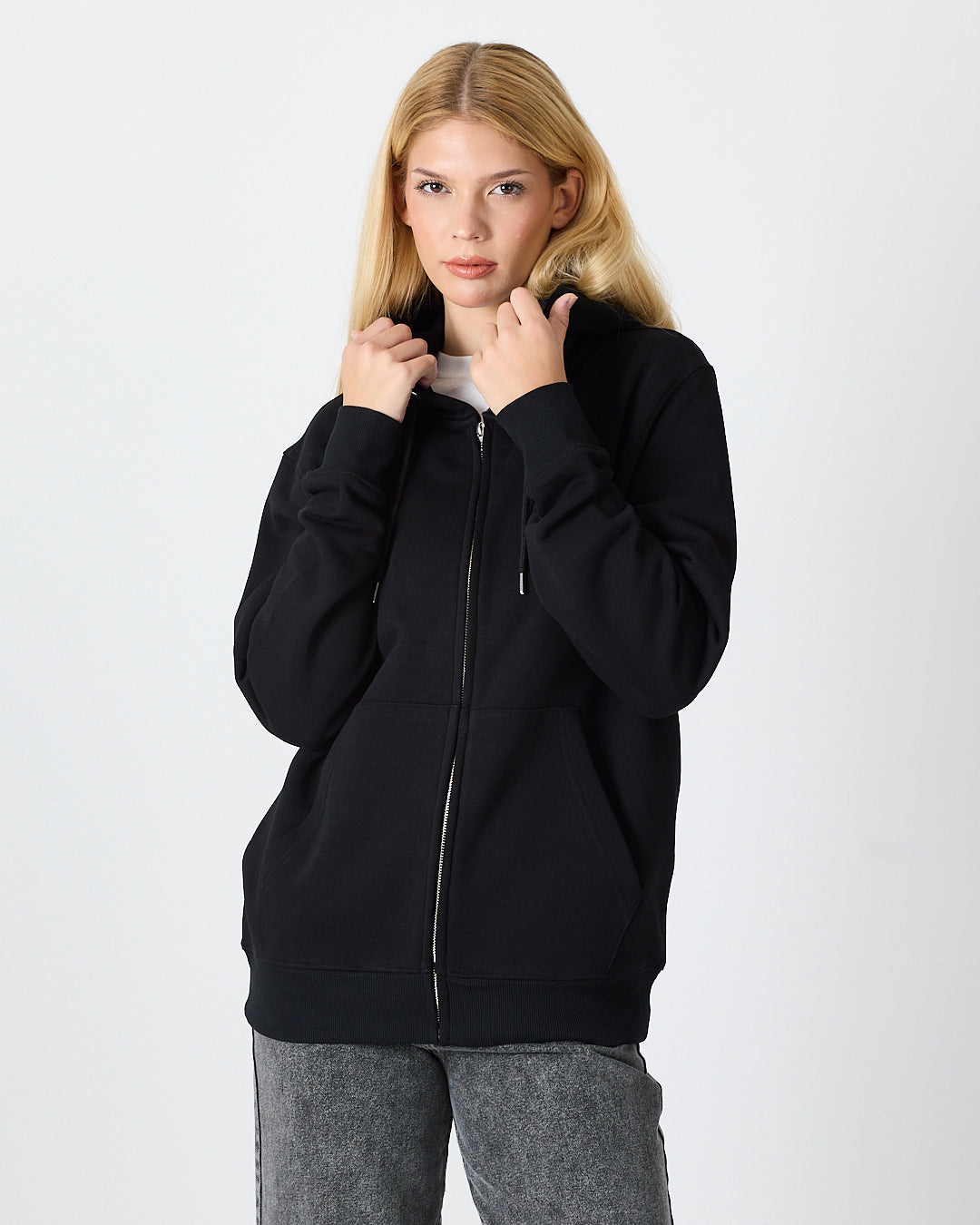 Siyah rengin zamansız duruşunu modern bir tasarımla birleştiren bu unisex fermuarlı sweatshirt, göğüs kısmındaki aplike detay ile sade ama karakterli bir görünüm sunar. Rahat kalıbı ve yumuşak dokusuyla gün boyu konfor sağlar; günlük stil ve şehir kombinleriyle kolayca uyum yakalar.