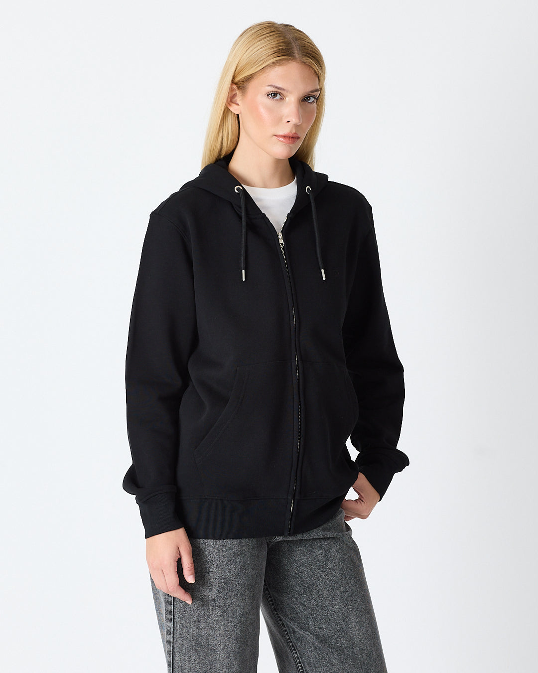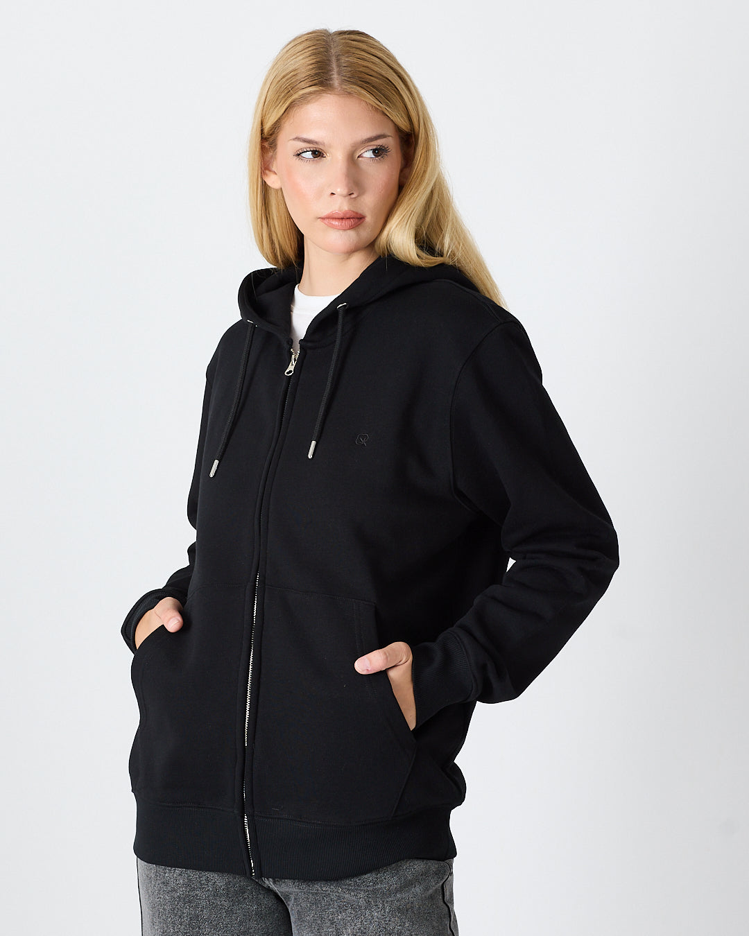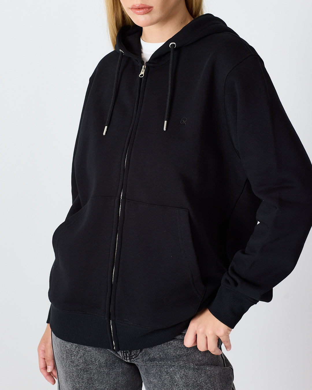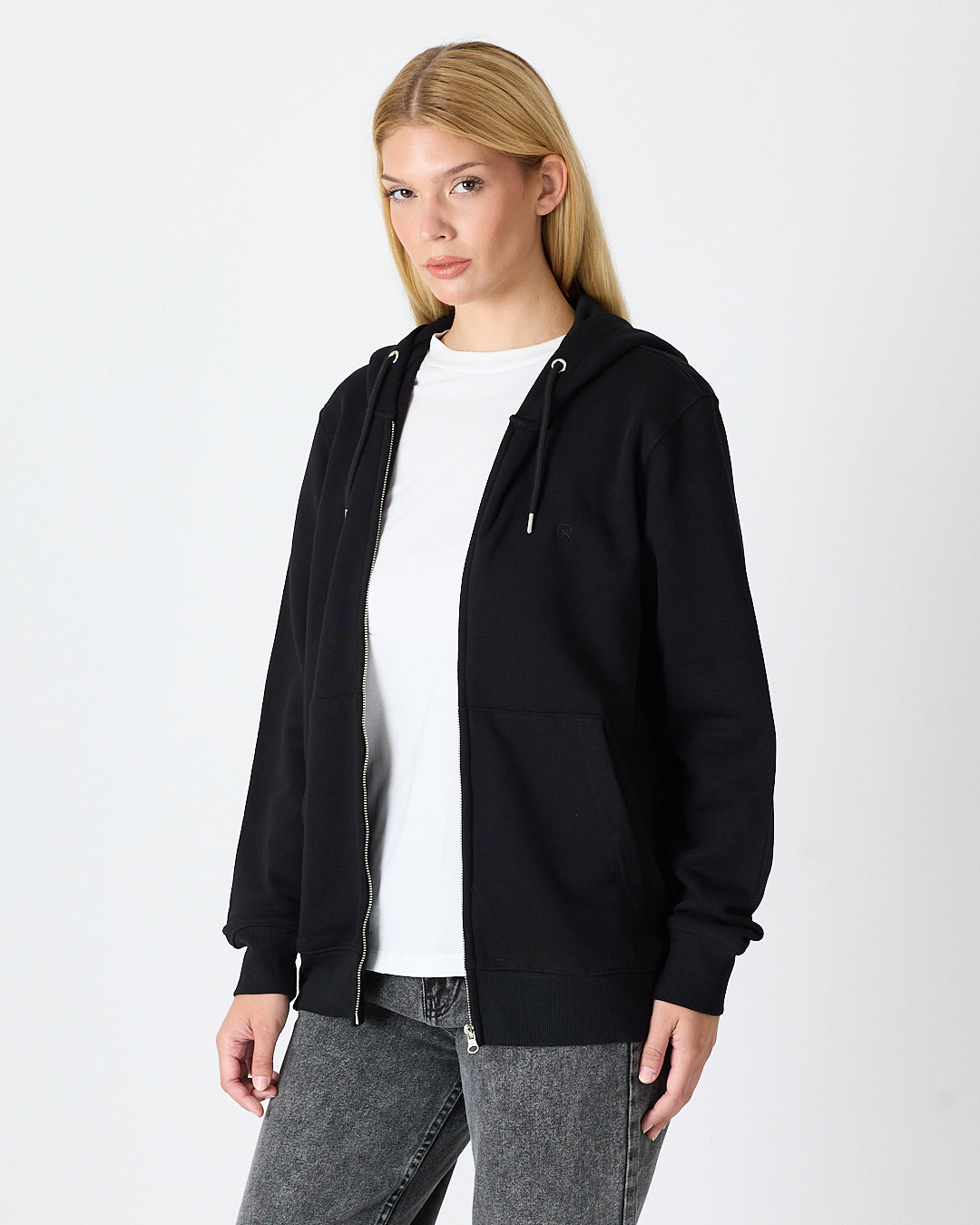 Siyah rengiyle sade ve modern bir görünüm sunan kapüşonlu fermuarlı hırka; standart kalıbı, şardonlu iç yüzeyi ve pratik fermuar tasarımıyla günlük kullanım için rahat hem de işlevsel bir seçenek sunar. Göğüs kısmındaki siyah tona ton logo nakış detayı minimal ve şık duruş sağlar.%100 pamuklu kumaşı sayesinde yumuşak dokuda, nefes alabilir ve gün boyu konfor sunar.