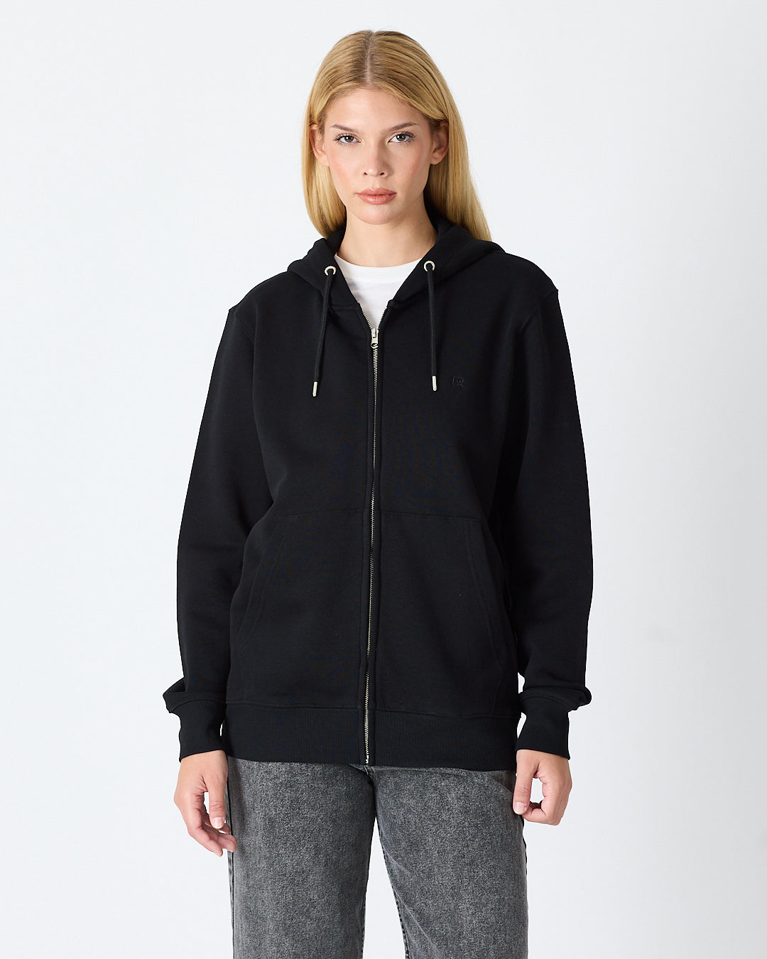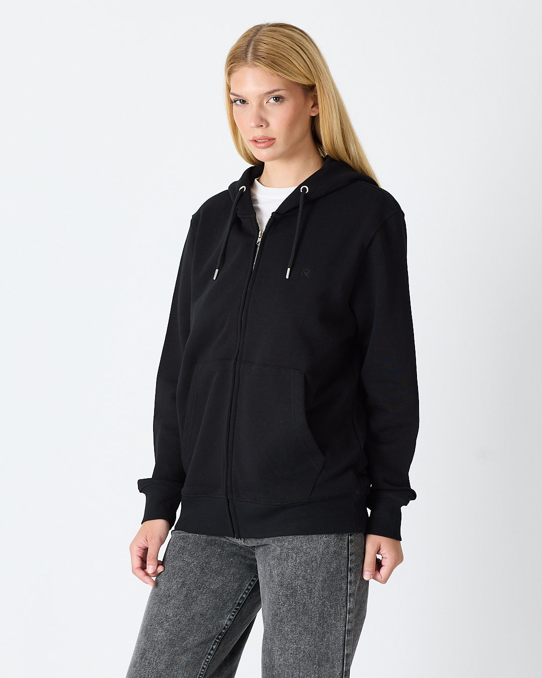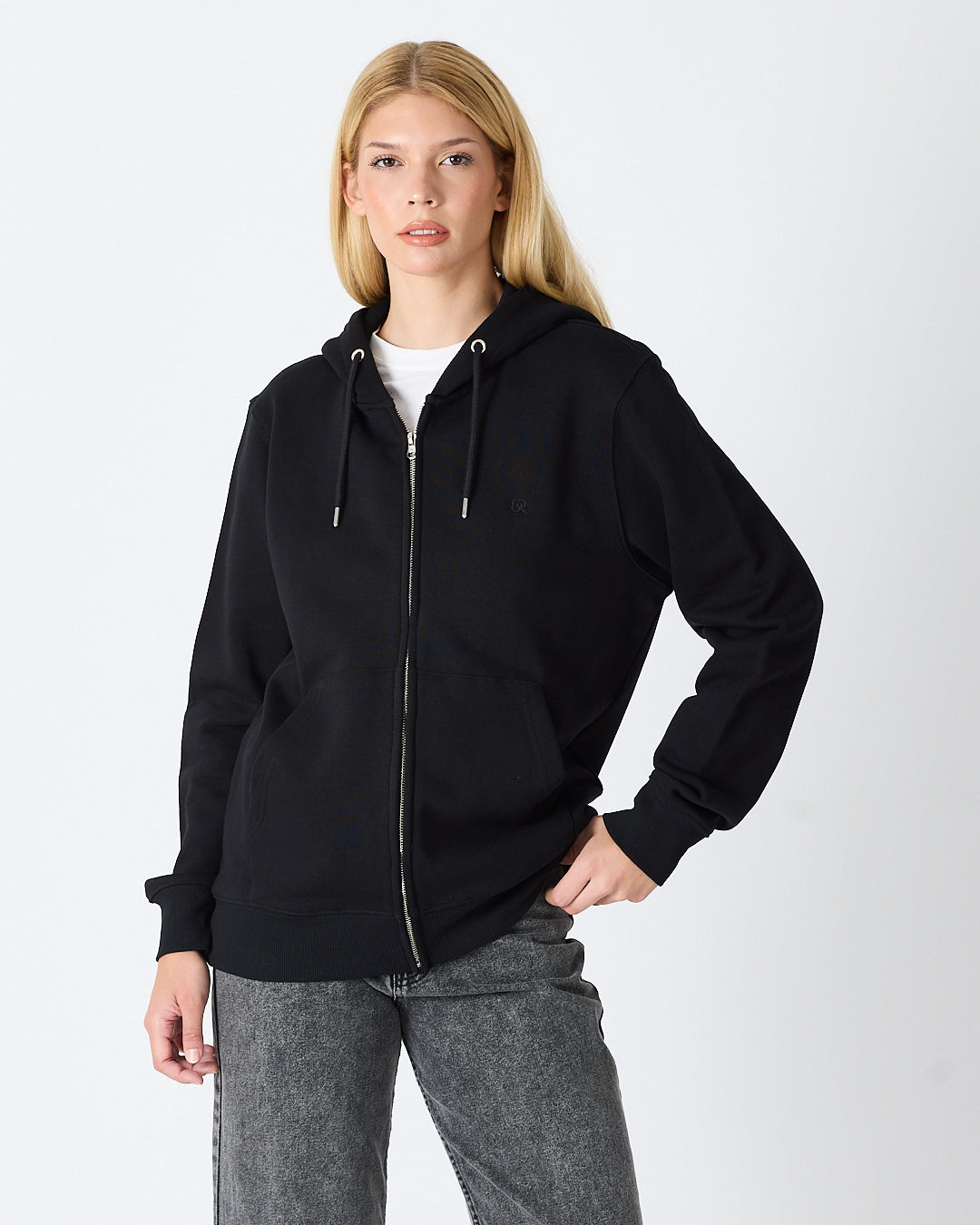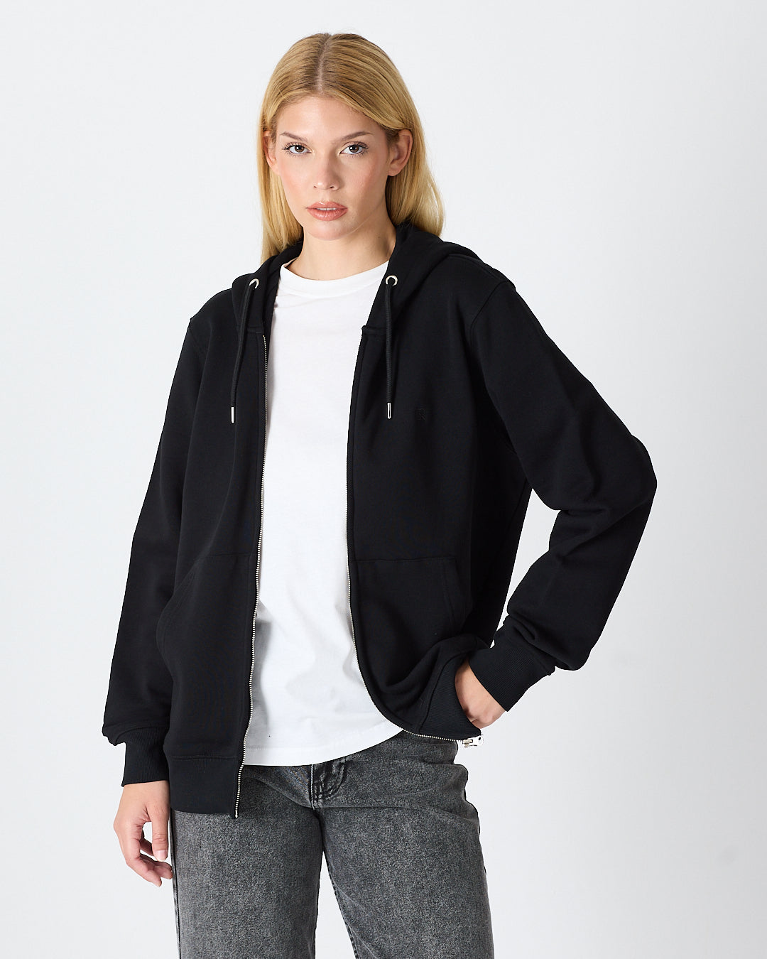Siyah rengiyle sade ve modern bir görünüm sunan kapüşonlu fermuarlı hırka; standart kalıbı, şardonlu iç yüzeyi ve pratik fermuar tasarımıyla günlük kullanım için rahat hem de işlevsel bir seçenek sunar. Göğüs kısmındaki siyah tona ton logo nakış detayı minimal ve şık duruş sağlar.%100 pamuklu kumaşı sayesinde yumuşak dokuda, nefes alabilir ve gün boyu konfor sunar.