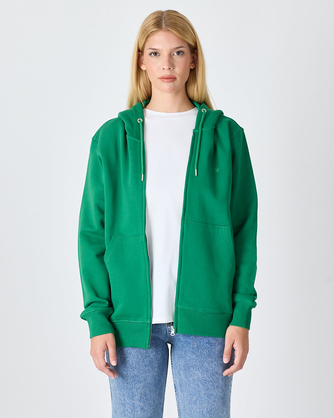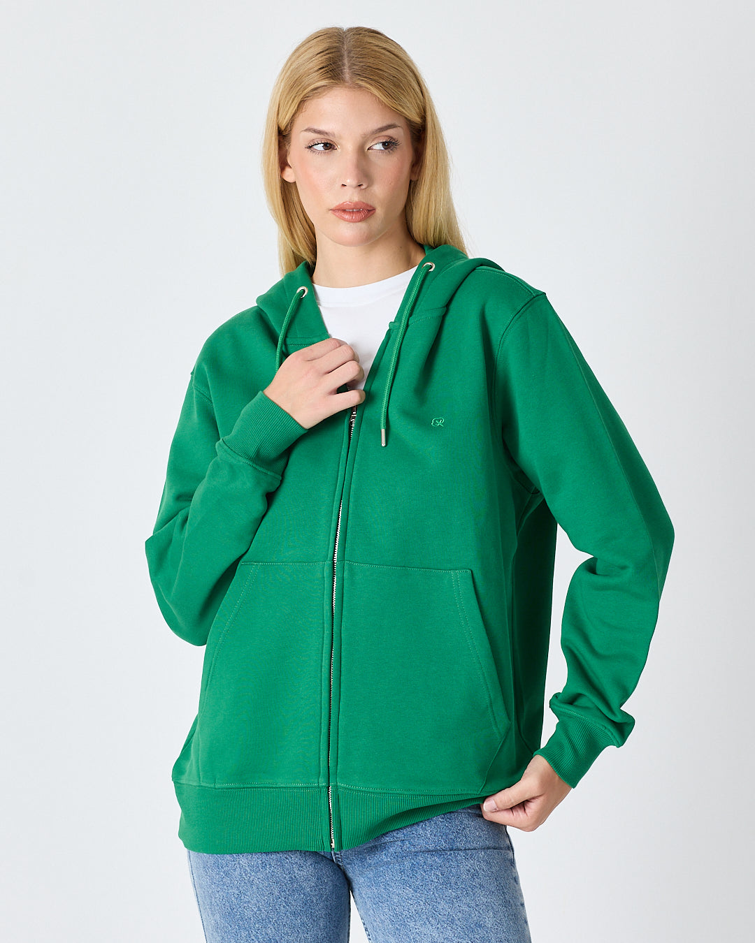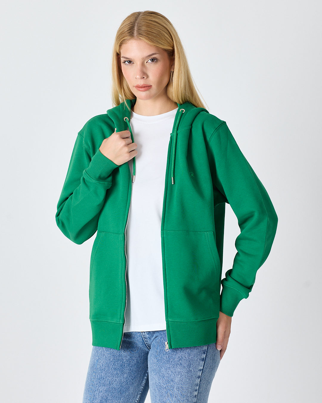 Çim yeşilinin enerjik ve modern tonunu yumuşak dokulu yapıyla buluşturan bu tam fermuarlı hoodie; rahat kalıbı, şardonlu iç yüzeyi ve aynı tonla uyumlu yeşil baskı detayıyla günlük kullanım için hem şık hem de konforlu bir seçenek sunar. Fermuarlı yapısı sayesinde kolayca giyilip çıkarılır ve casual kombinlere mükemmel şekilde uyum sağlar.