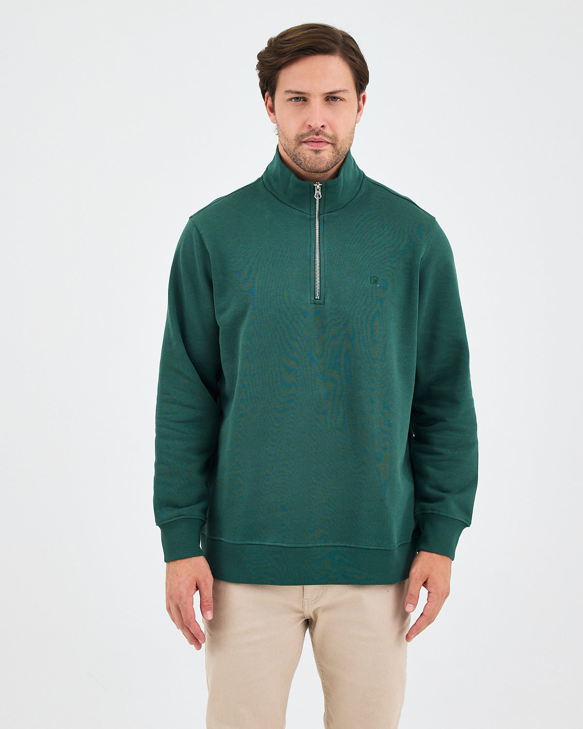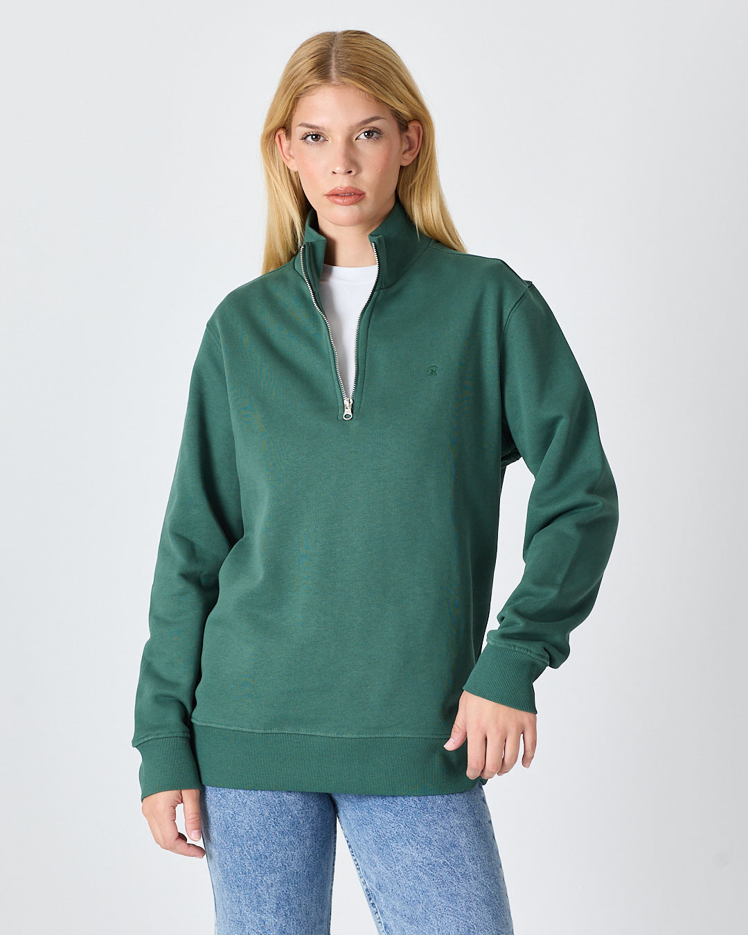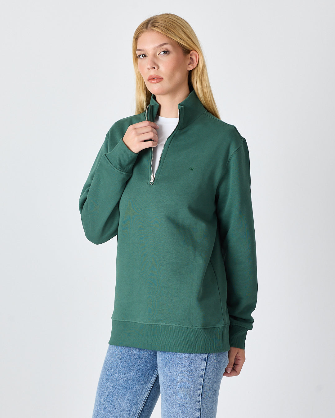 Koyu yeşil rengiyle modern ve sade bir görünüm sunan bu yarım fermuarlı sweatshirt; standart kalıbı, şardonlu iç yüzeyi ve yüksek yaka formuyla günlük kullanım için hem konforlu hem de şık bir seçenek sunar. Ana tonla uyumlu tona ton logo nakış detayı, minimal ve zarif bir duruş sağlar. %100 pamuklu yapısı sayesinde yumuşak dokulu, nefes alabilir ve gün boyu konfor sunar.
