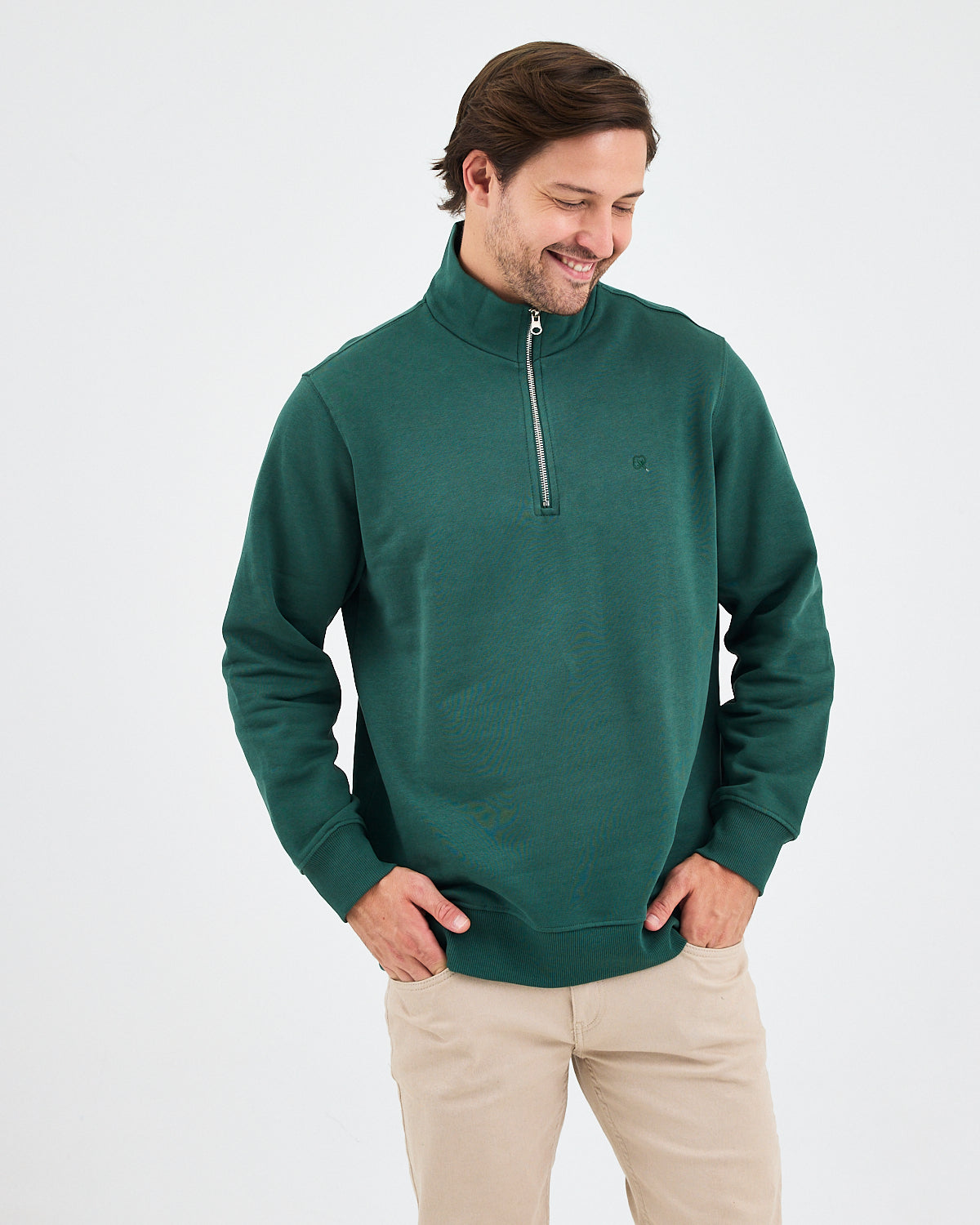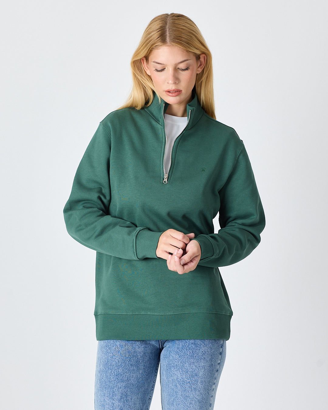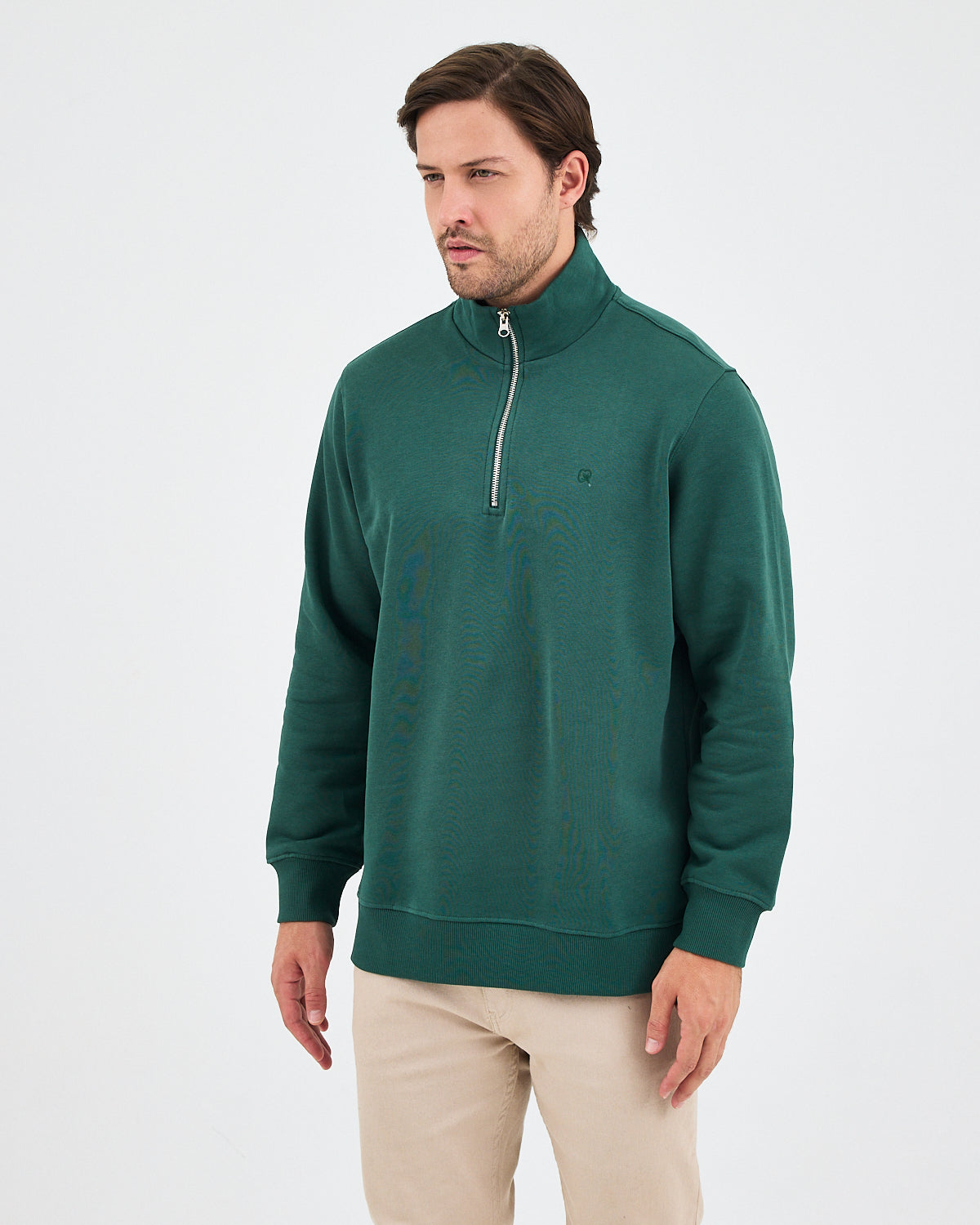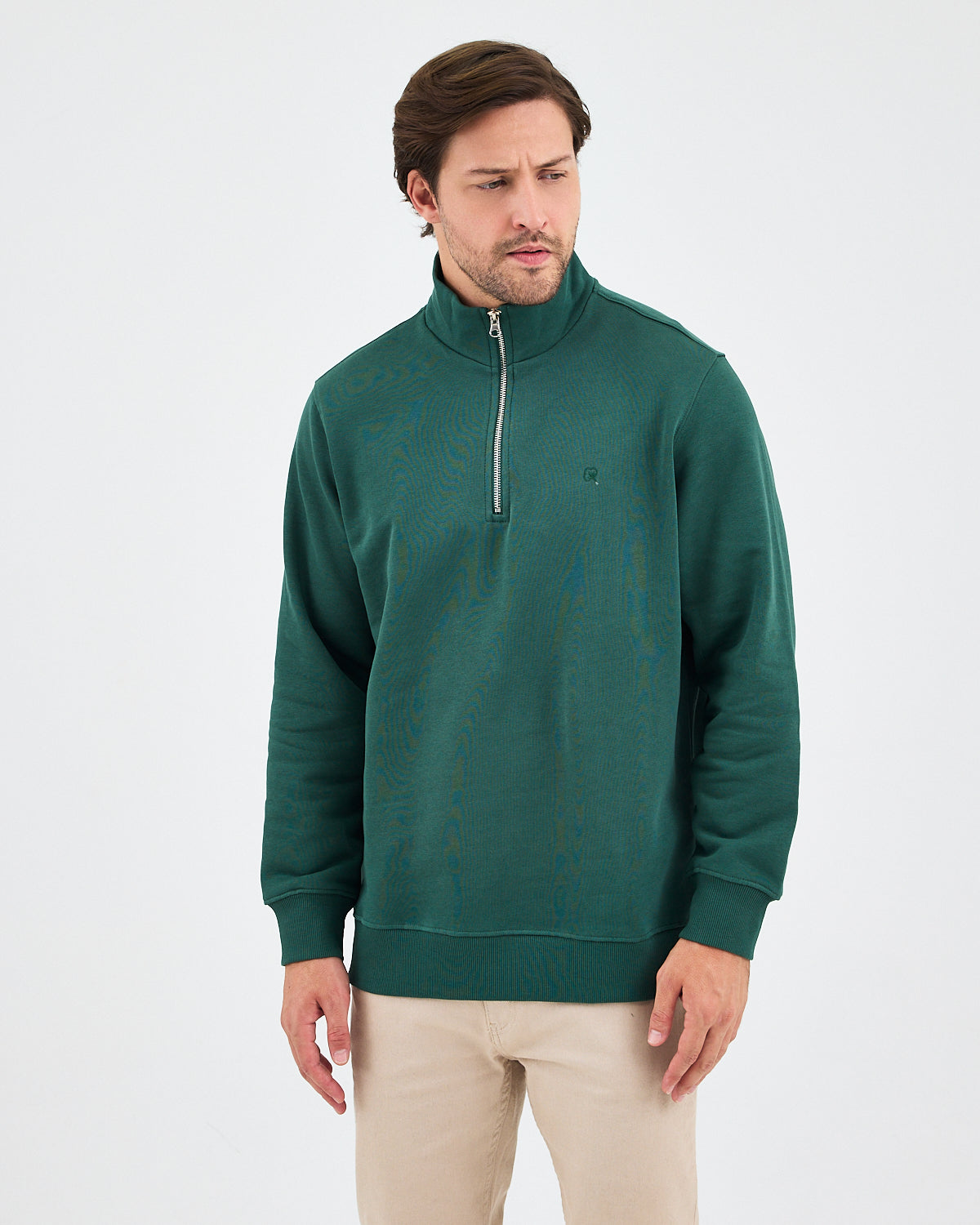 Koyu yeşil rengiyle modern ve sade bir görünüm sunan bu yarım fermuarlı sweatshirt; standart kalıbı, şardonlu iç yüzeyi ve yüksek yaka formuyla günlük kullanım için hem konforlu hem de şık bir seçenek sunar. Ana tonla uyumlu tona ton logo nakış detayı, minimal ve zarif bir duruş sağlar. %100 pamuklu yapısı sayesinde yumuşak dokulu, nefes alabilir ve gün boyu konfor sunar.