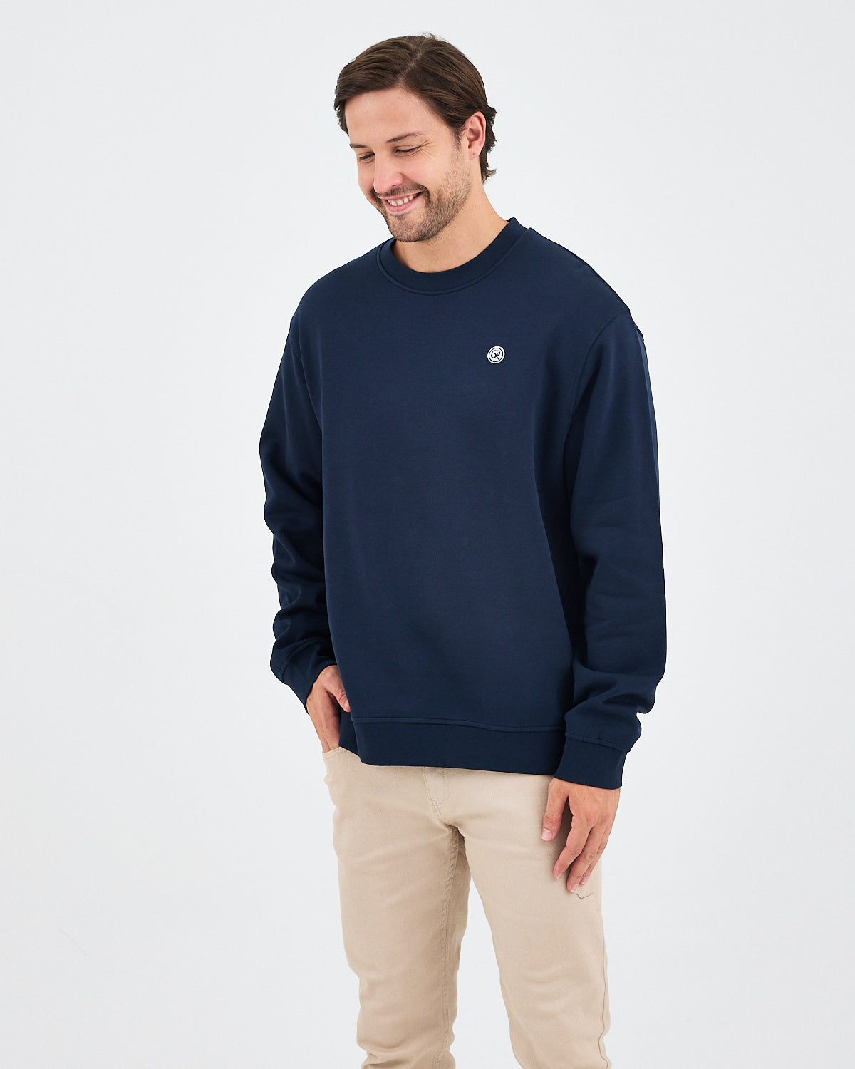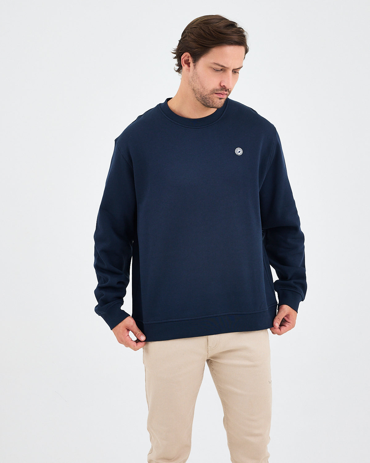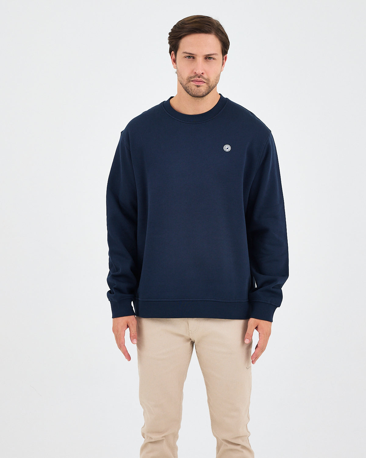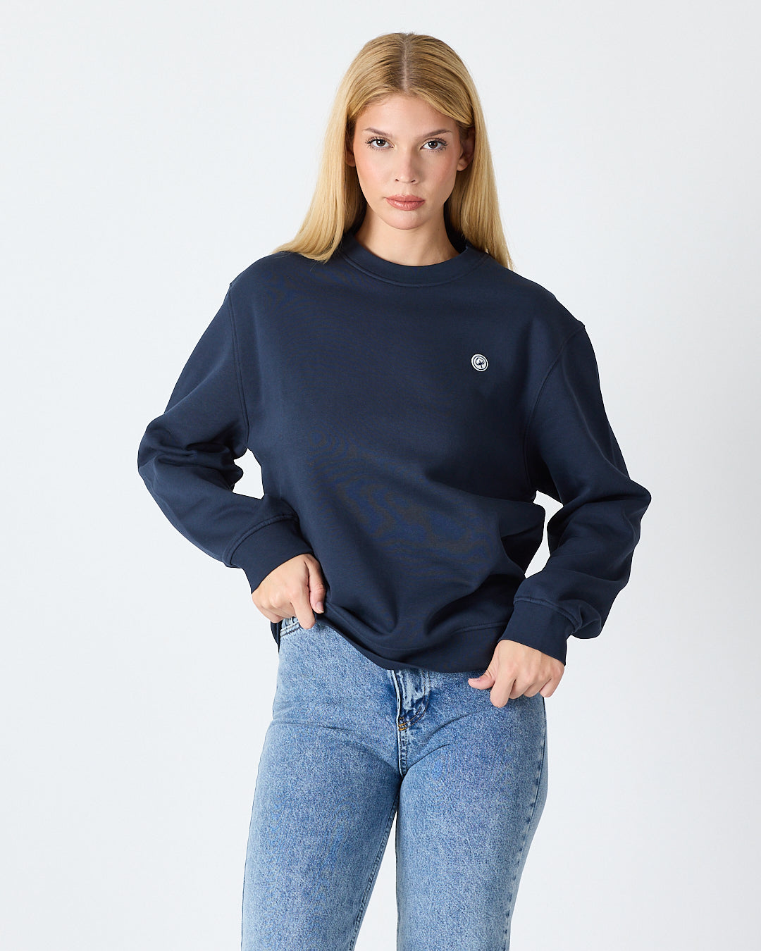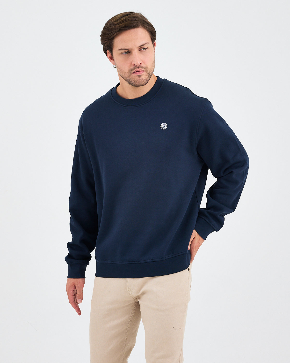 Lacivert tonu ile her kombine kolayca uyum sağlayan bu unisex sweatshirt, göğüs kısmındaki beyaz aplike logo detayı ile sade ama modern bir görünüm sunar. Rahat kesimi ve yumuşak dokusuyla gün boyu konfor sağlar; günlük kullanımdan hafta sonu stiline kadar her tarza uyumludur.