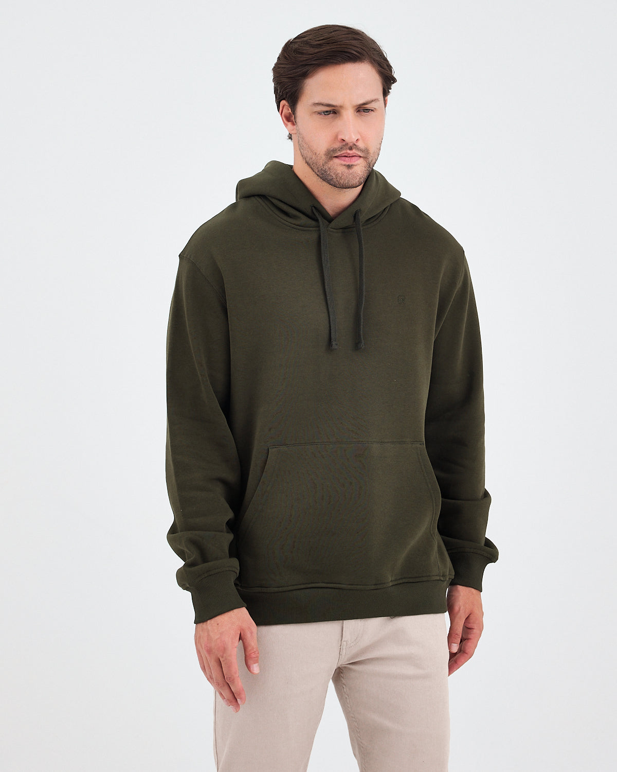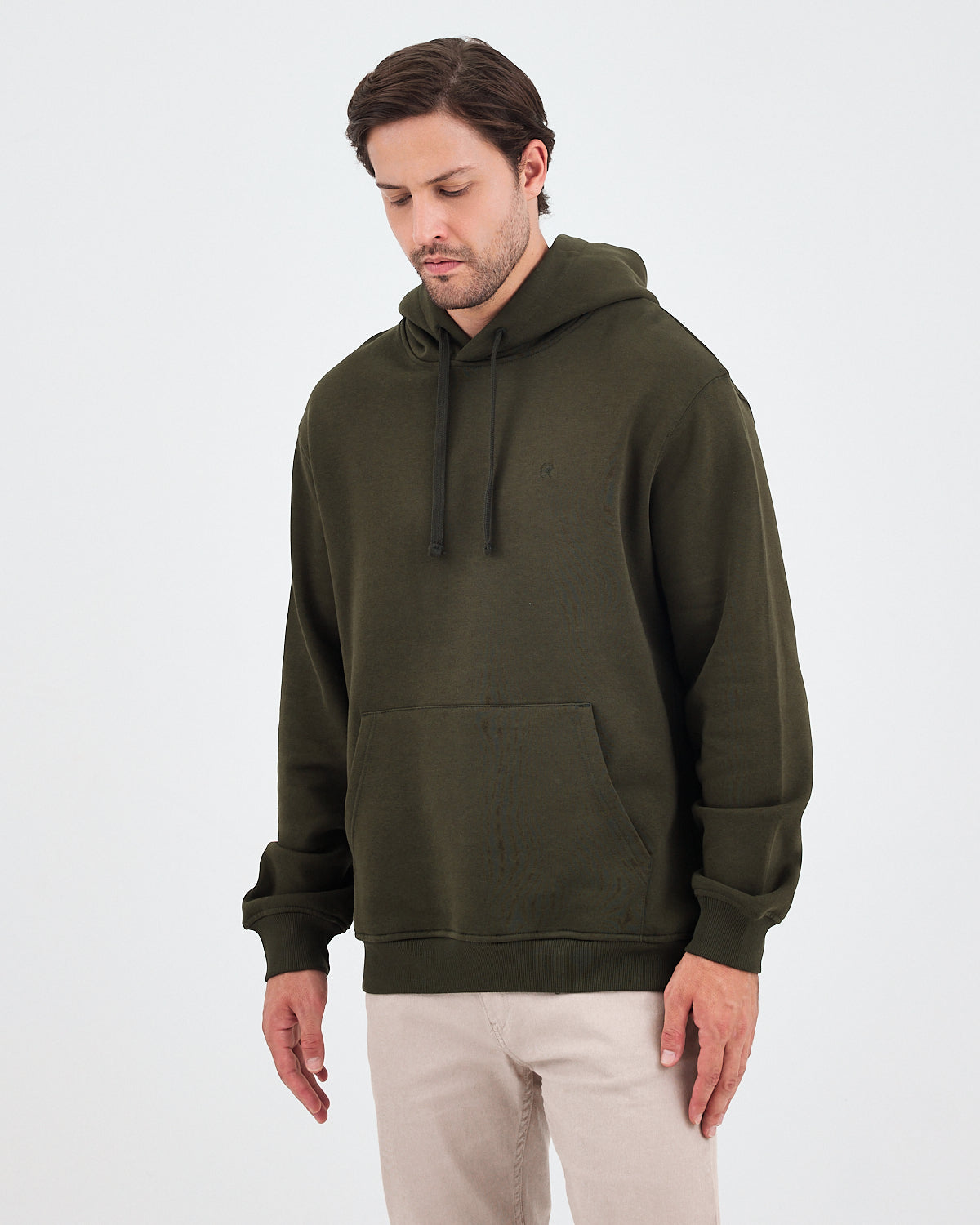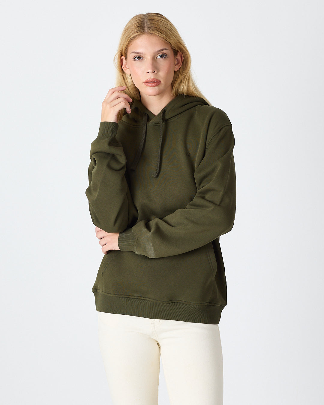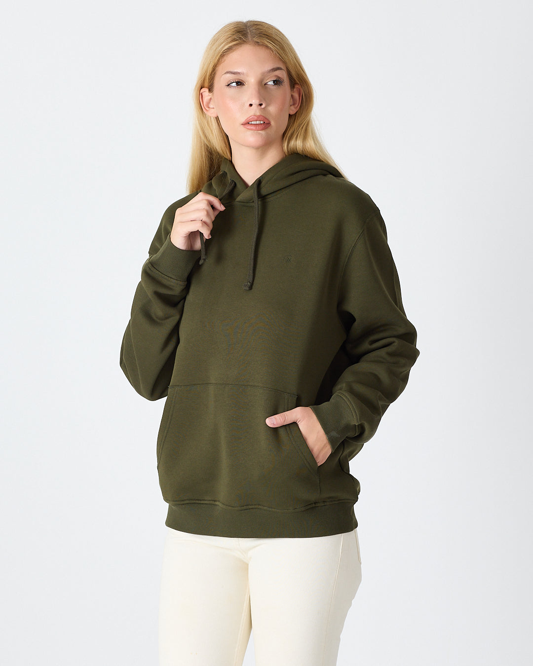Haki renginin doğal ve güçlü tonunu organik pamuklu dokuyla birleştiren bu kapüşonlu sweatshirt; şardonlu iç yüzeyi, rahat kalıbı ve asker yeşili tona ton nakış detayıyla hem modern hem de konforlu bir görünüm sunar. Günlük kullanım için ideal olan bu model, sıcak tutan yapısı ve sade tasarımıyla her stile kolayca uyum sağlar.
