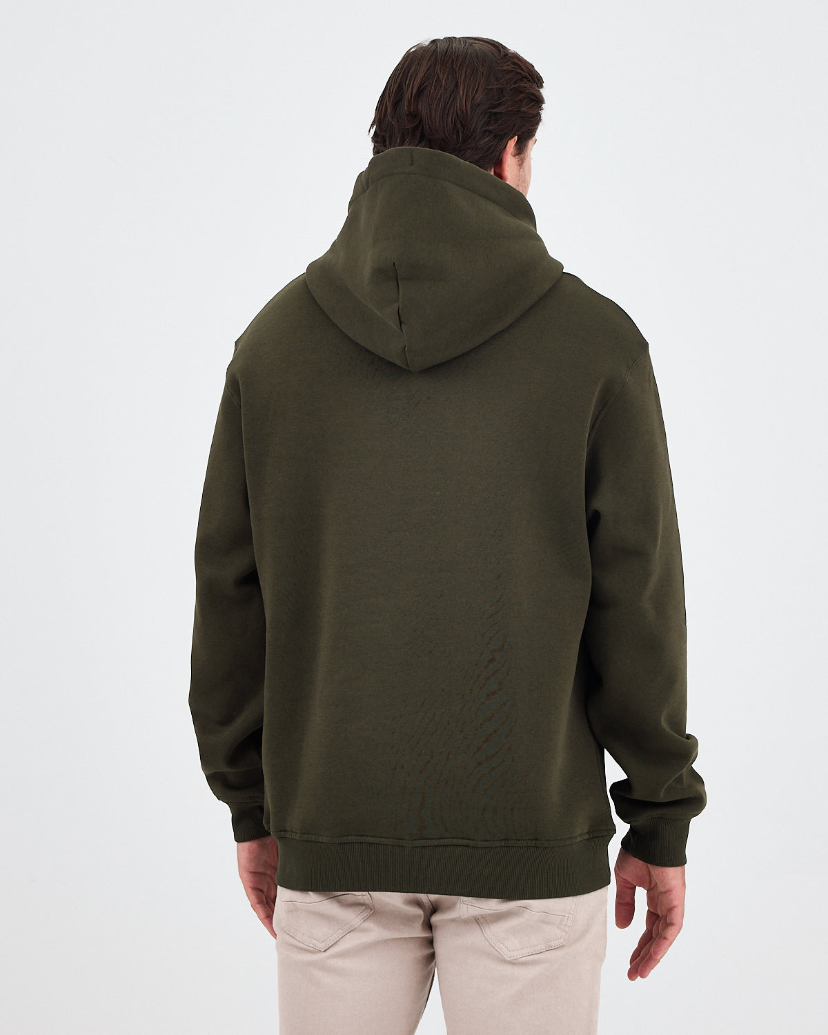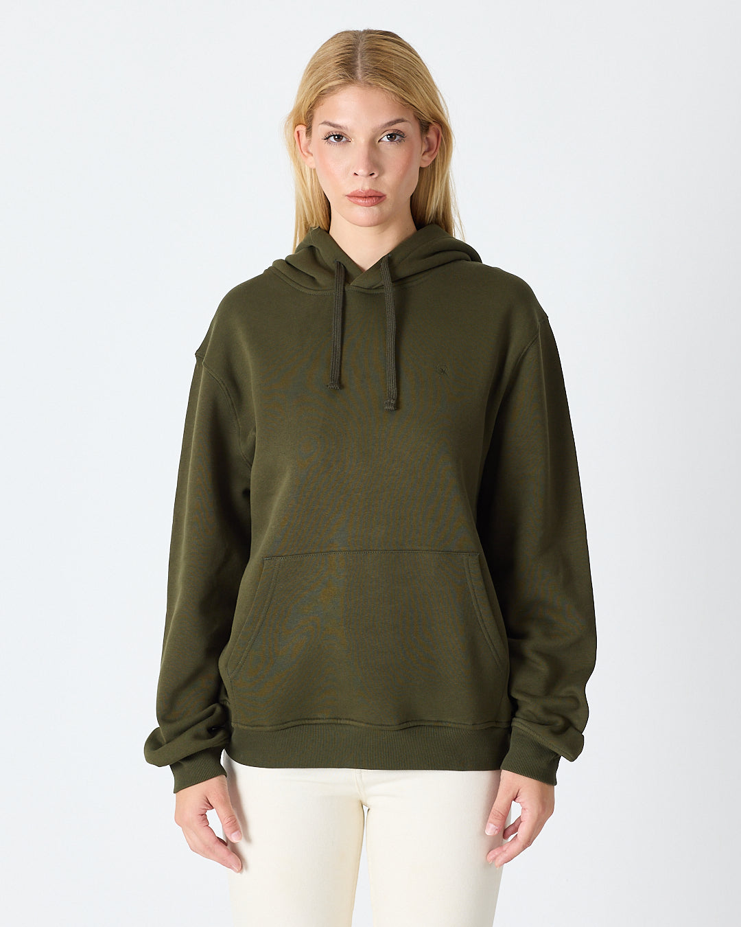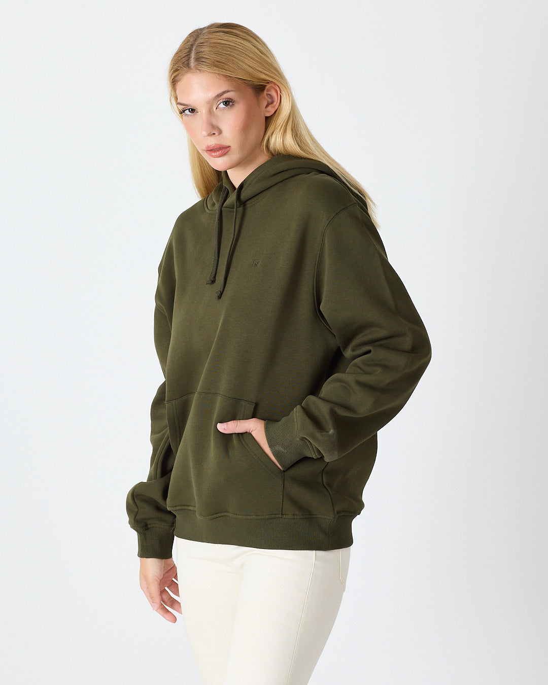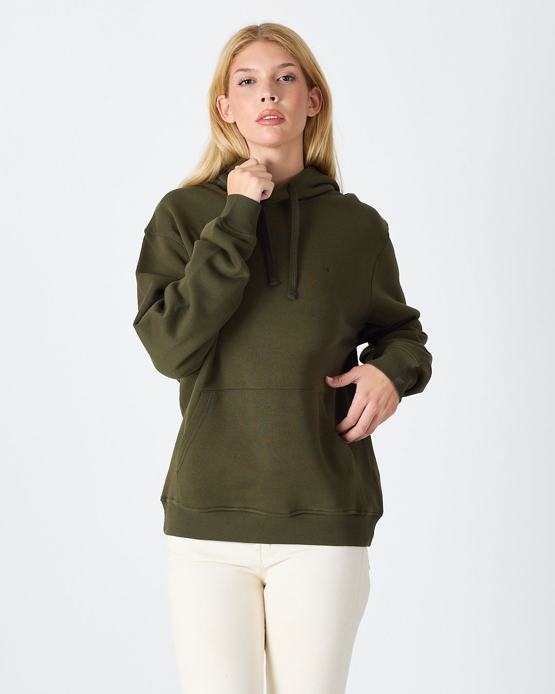 Haki renginin doğal ve güçlü tonunu organik pamuklu dokuyla birleştiren bu kapüşonlu sweatshirt; şardonlu iç yüzeyi, rahat kalıbı ve asker yeşili tona ton nakış detayıyla hem modern hem de konforlu bir görünüm sunar. Günlük kullanım için ideal olan bu model, sıcak tutan yapısı ve sade tasarımıyla her stile kolayca uyum sağlar.