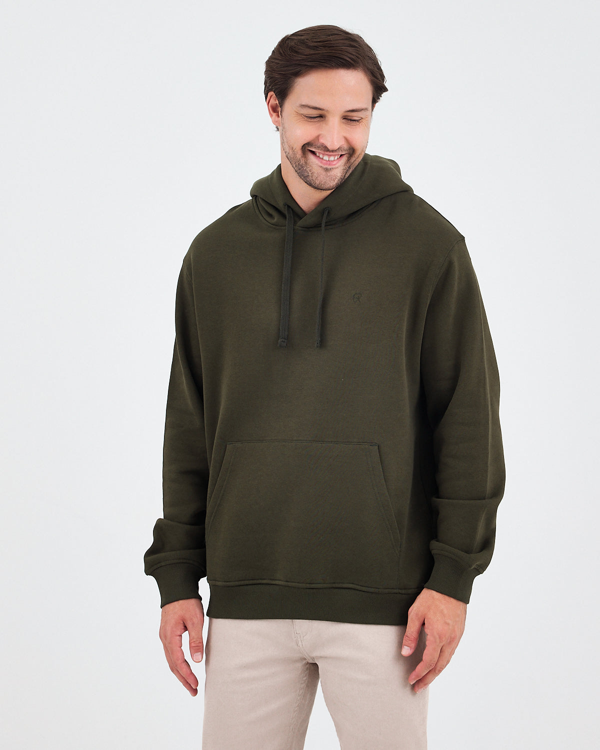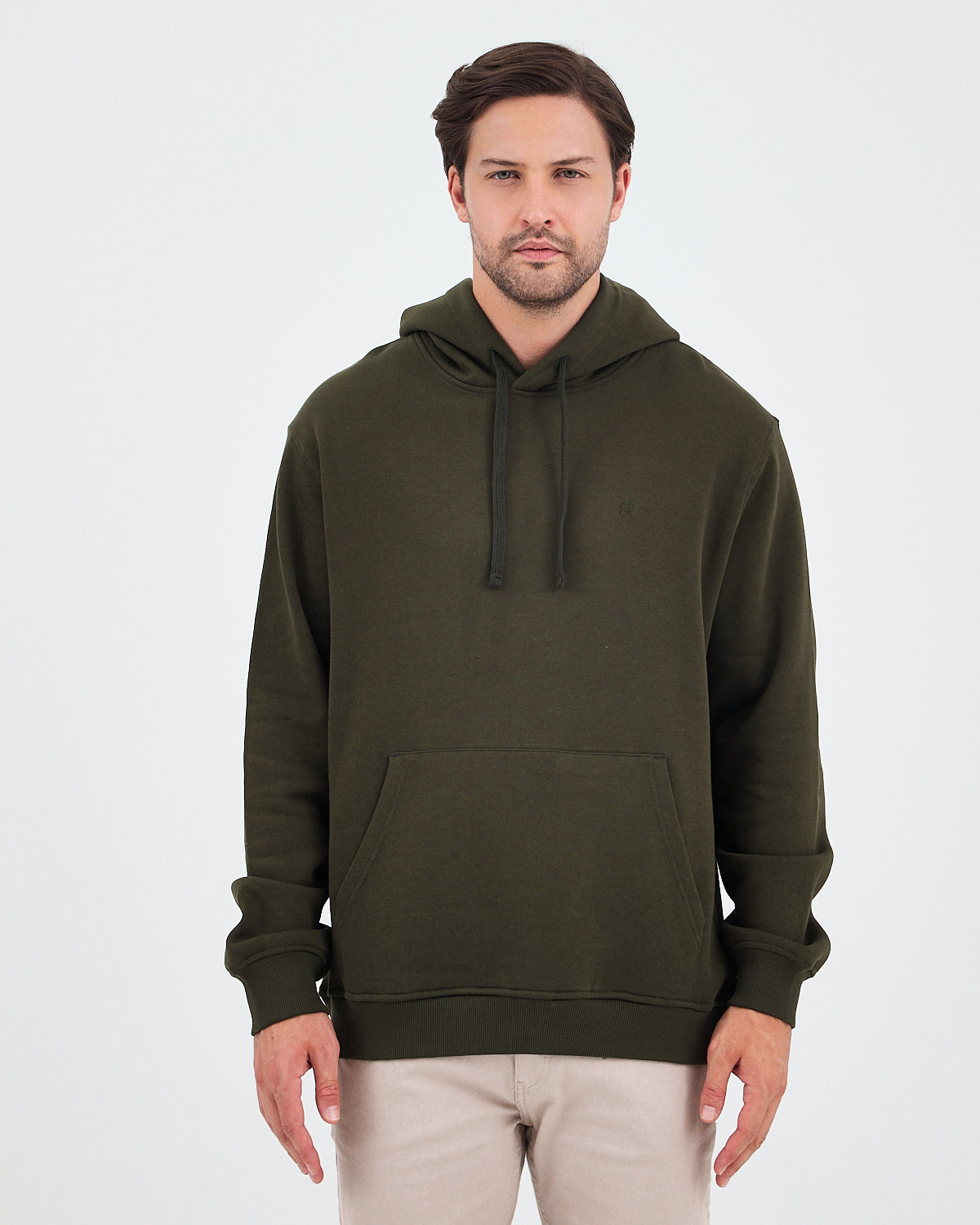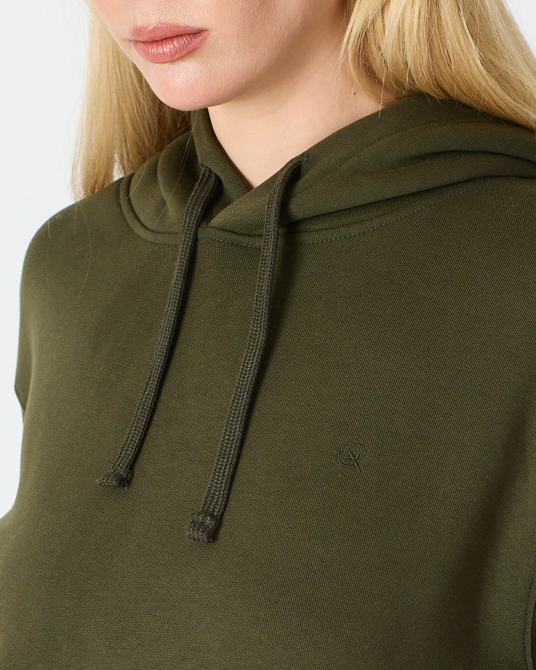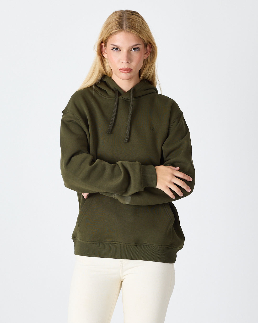 Haki renginin doğal ve güçlü tonunu organik pamuklu dokuyla birleştiren bu kapüşonlu sweatshirt; şardonlu iç yüzeyi, rahat kalıbı ve asker yeşili tona ton nakış detayıyla hem modern hem de konforlu bir görünüm sunar. Günlük kullanım için ideal olan bu model, sıcak tutan yapısı ve sade tasarımıyla her stile kolayca uyum sağlar.