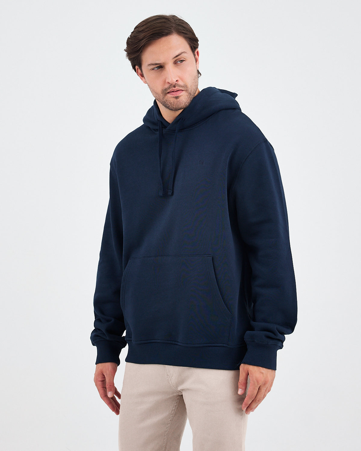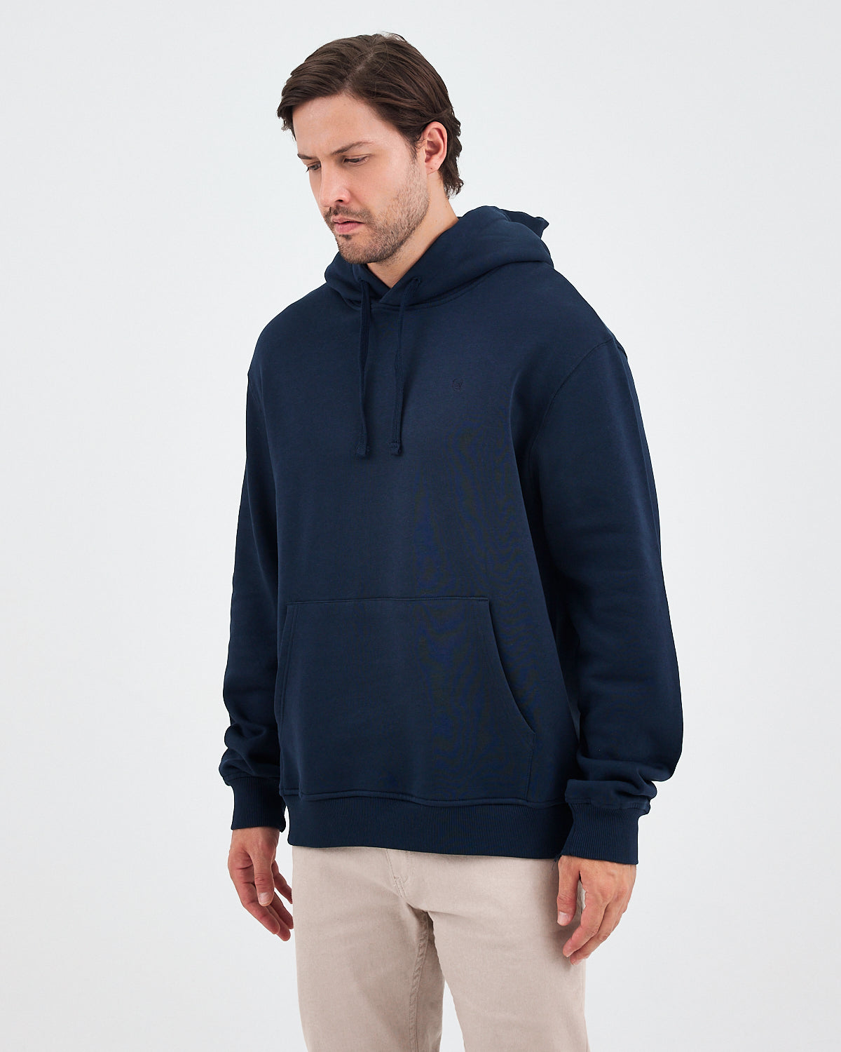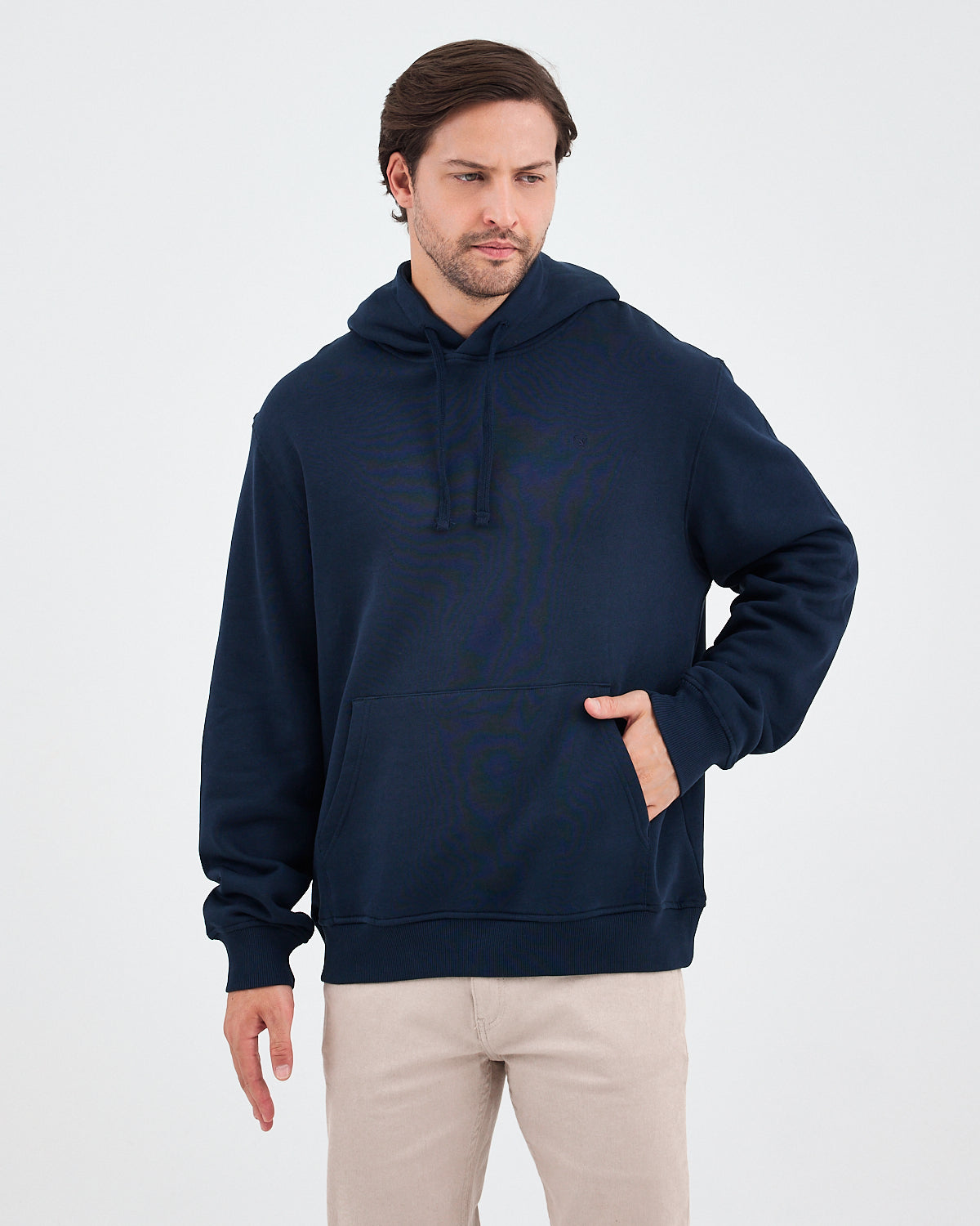 Lacivert rengin zamansız şıklığını organik pamuklu dokuyla buluşturan bu kapüşonlu sweatshirt; yumuşacık şardonlu iç yüzeyi ve siyah tona ton nakış detayıyla hem rahat hem de modern bir görünüm sunar. Günlük kullanım için ideal olan bu model, konforlu yapısı ve temiz duruşuyla gardırobun vazgeçilmez parçalarından biri olmaya adaydır.