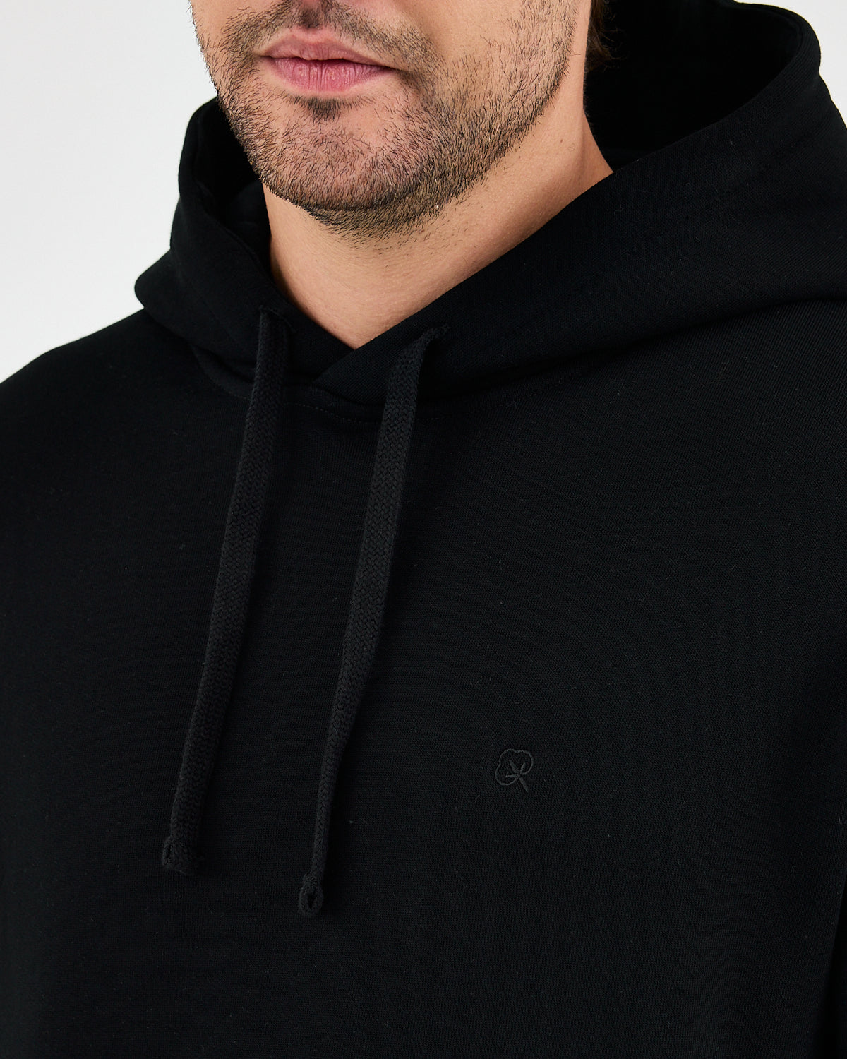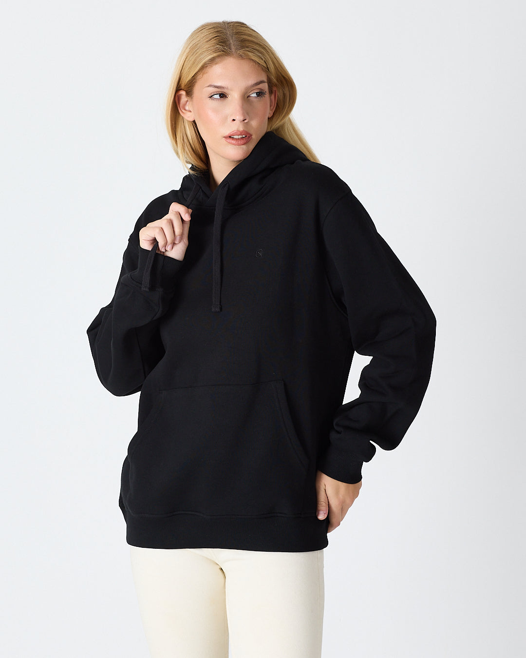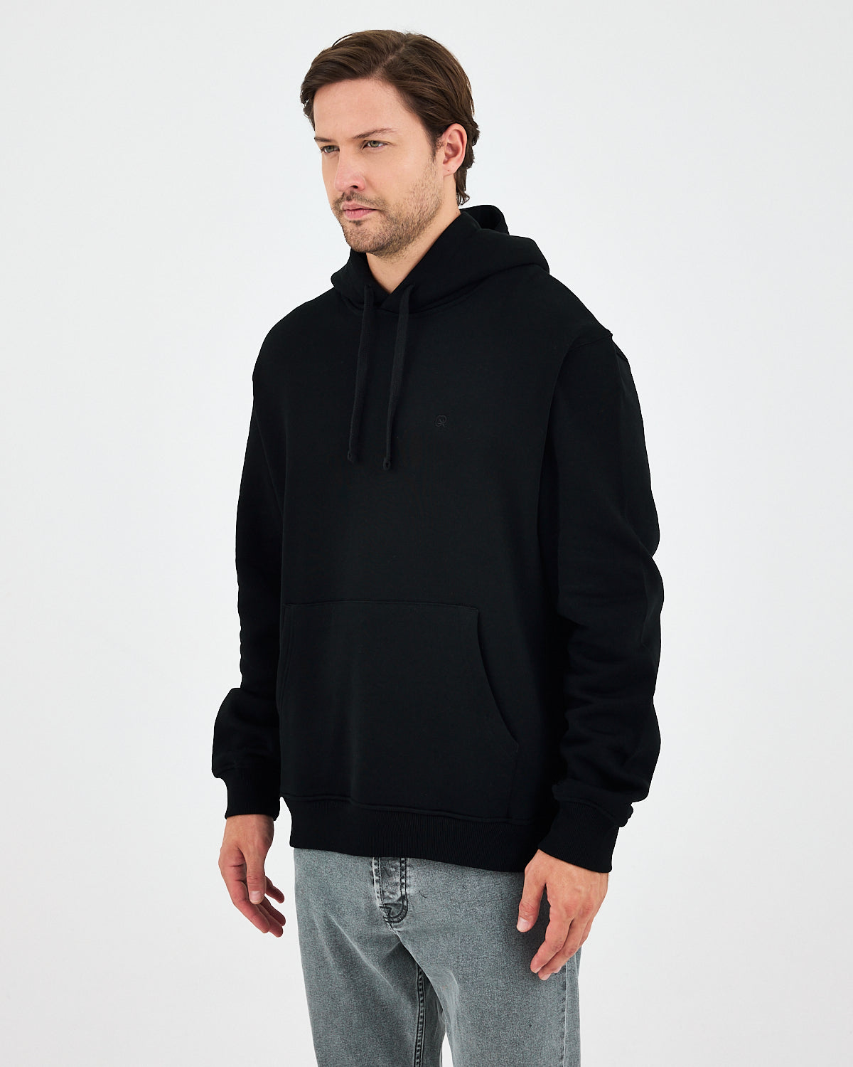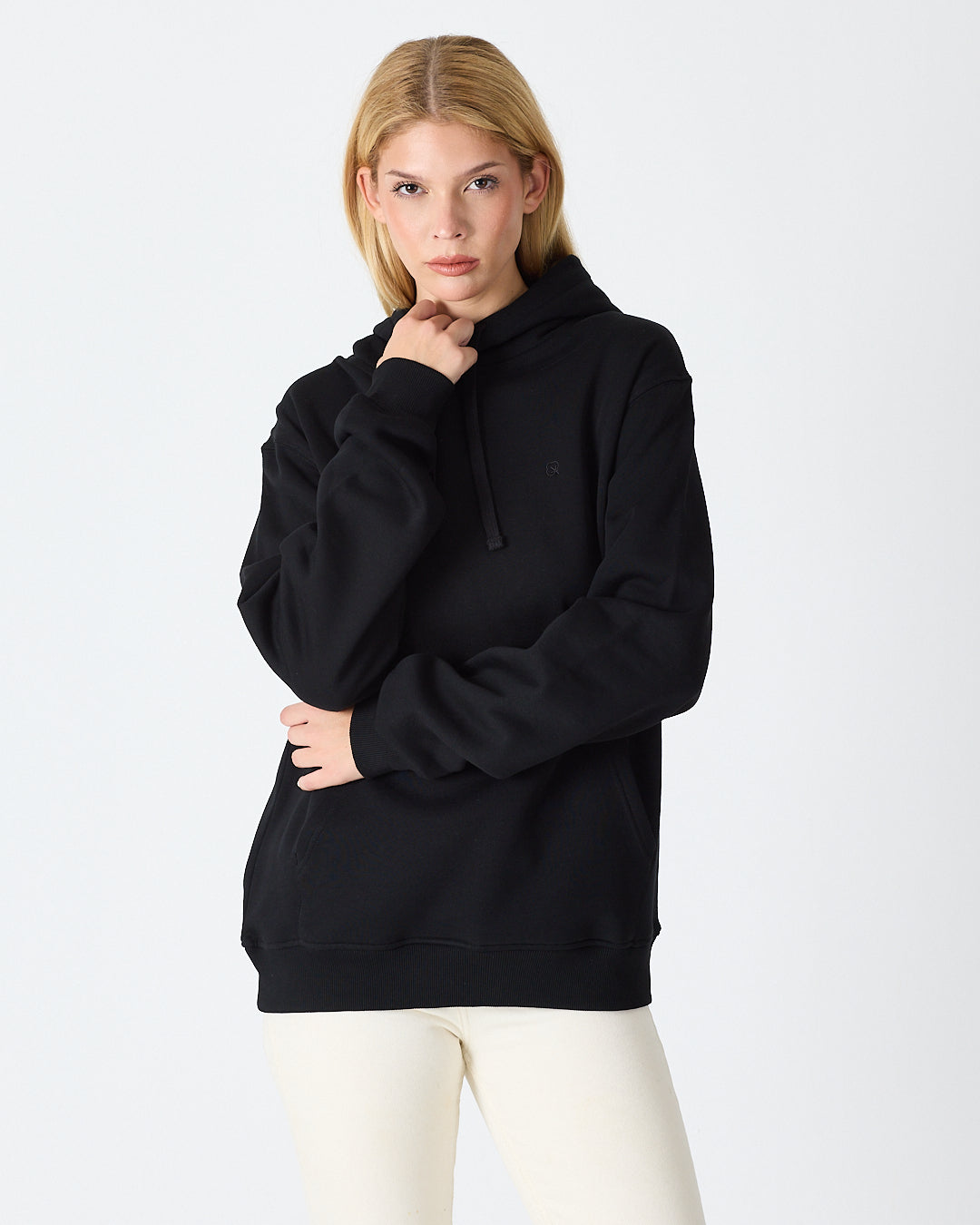 Siyah rengin zamansız şıklığını organik pamuklu dokuyla buluşturan bu kapüşonlu sweatshirt; yumuşacık şardonlu iç yüzeyi ve siyah tona ton nakış detayıyla hem rahat hem de modern bir görünüm sunar. Günlük kullanım için ideal olan bu model, konforlu yapısı ve temiz duruşuyla gardırobun vazgeçilmez parçalarından biri olmaya adaydır.