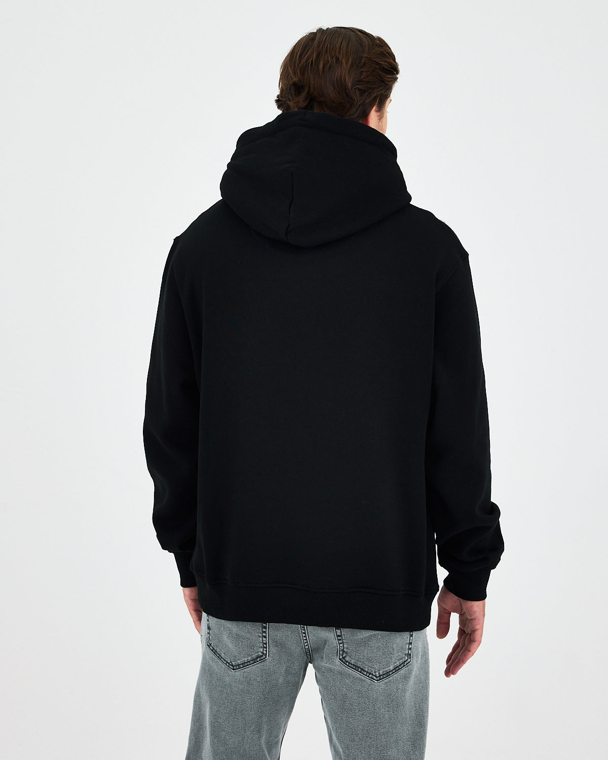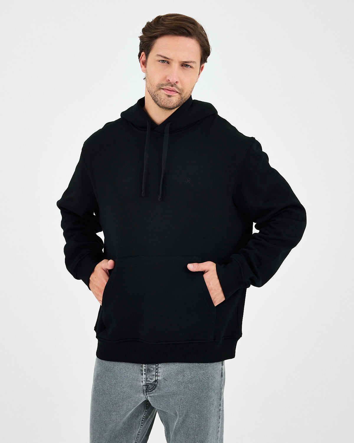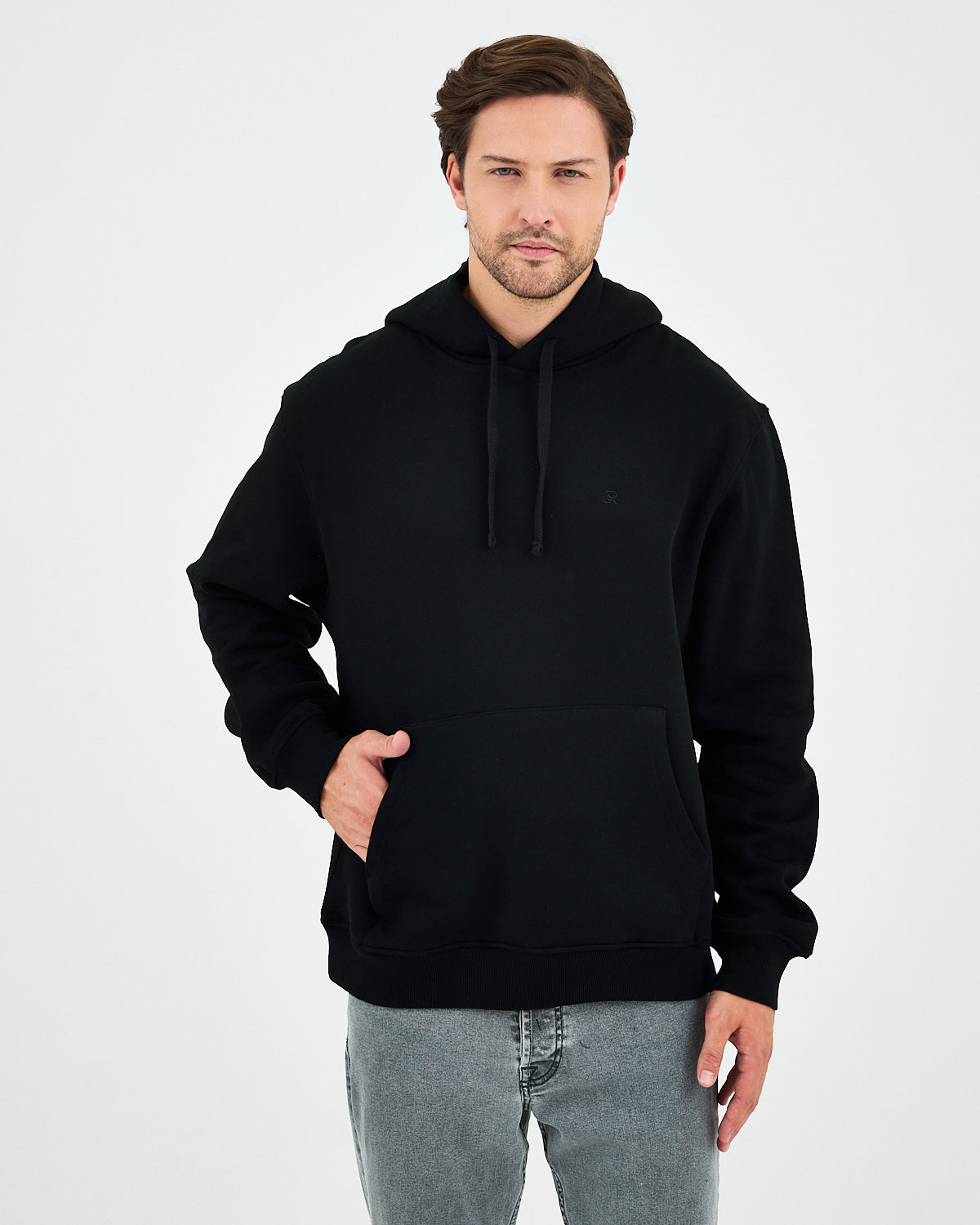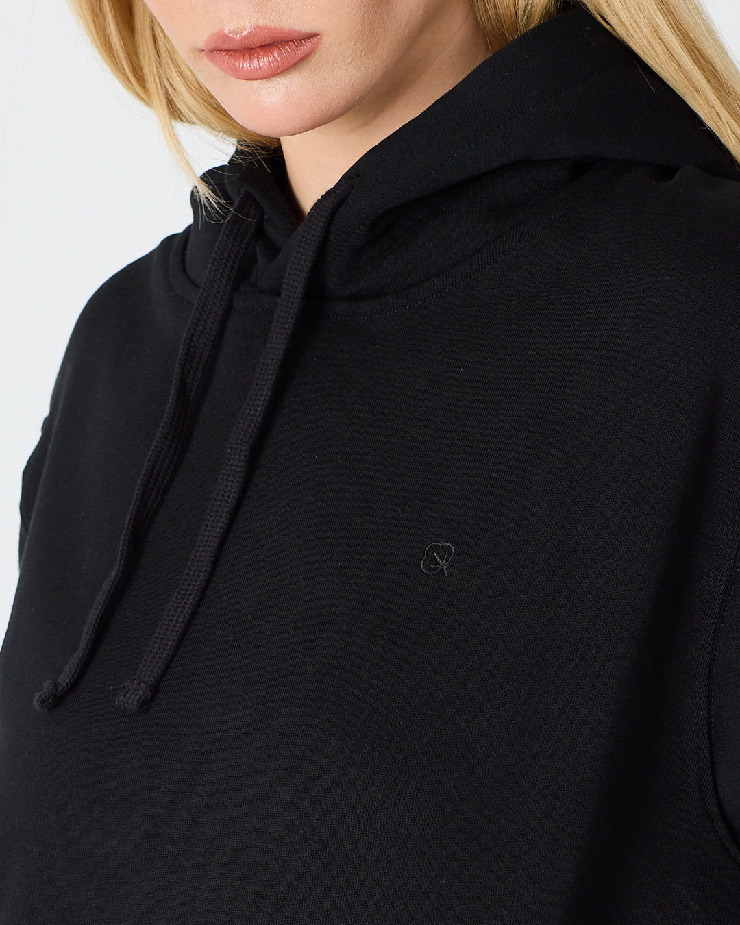 Siyah rengin zamansız şıklığını organik pamuklu dokuyla buluşturan bu kapüşonlu sweatshirt; yumuşacık şardonlu iç yüzeyi ve siyah tona ton nakış detayıyla hem rahat hem de modern bir görünüm sunar. Günlük kullanım için ideal olan bu model, konforlu yapısı ve temiz duruşuyla gardırobun vazgeçilmez parçalarından biri olmaya adaydır.