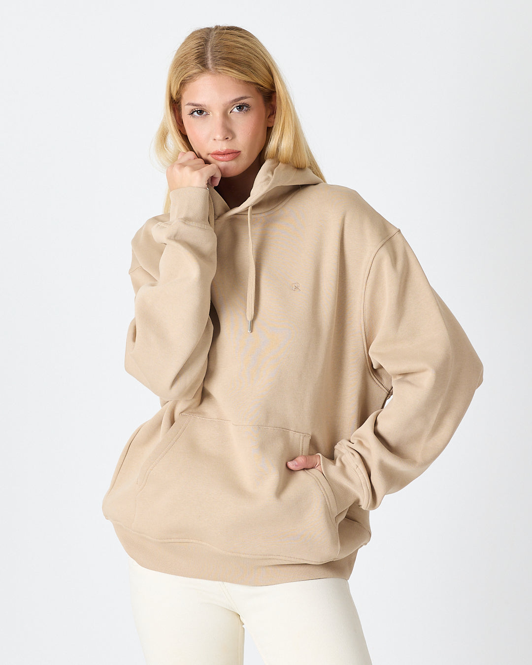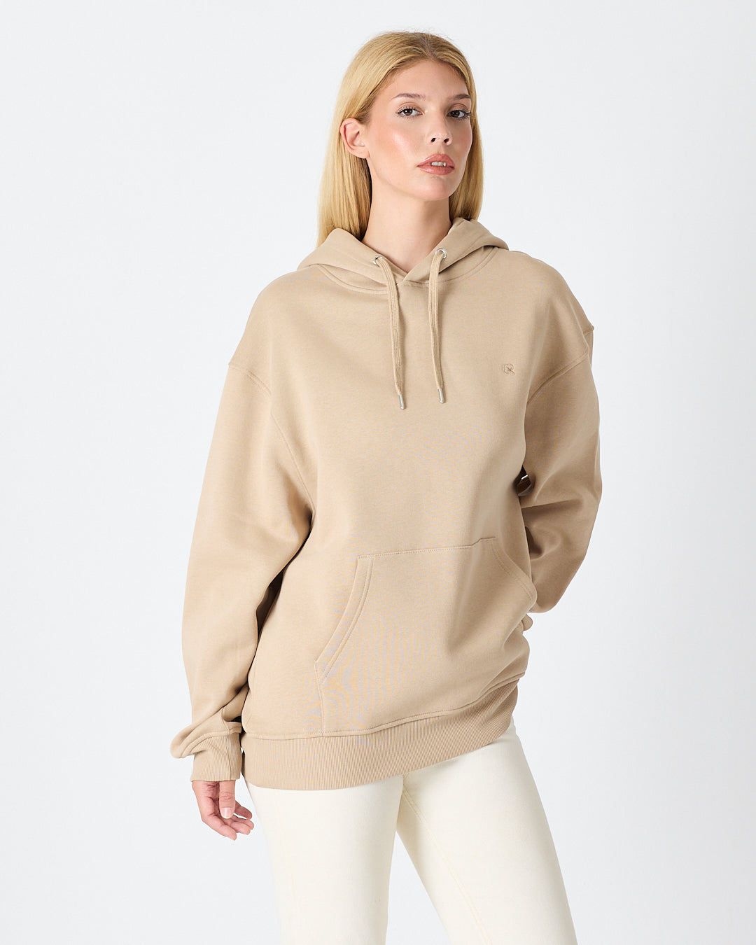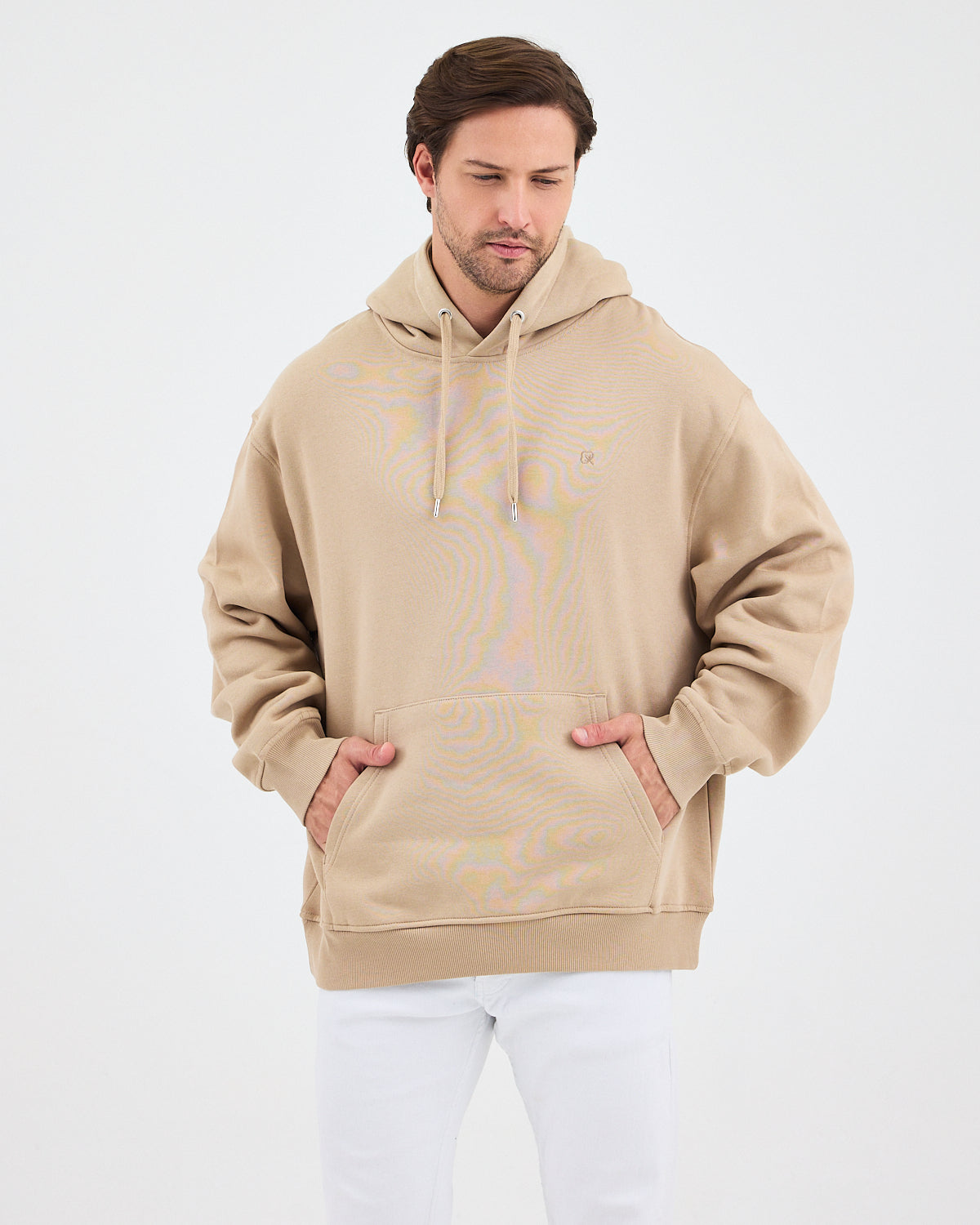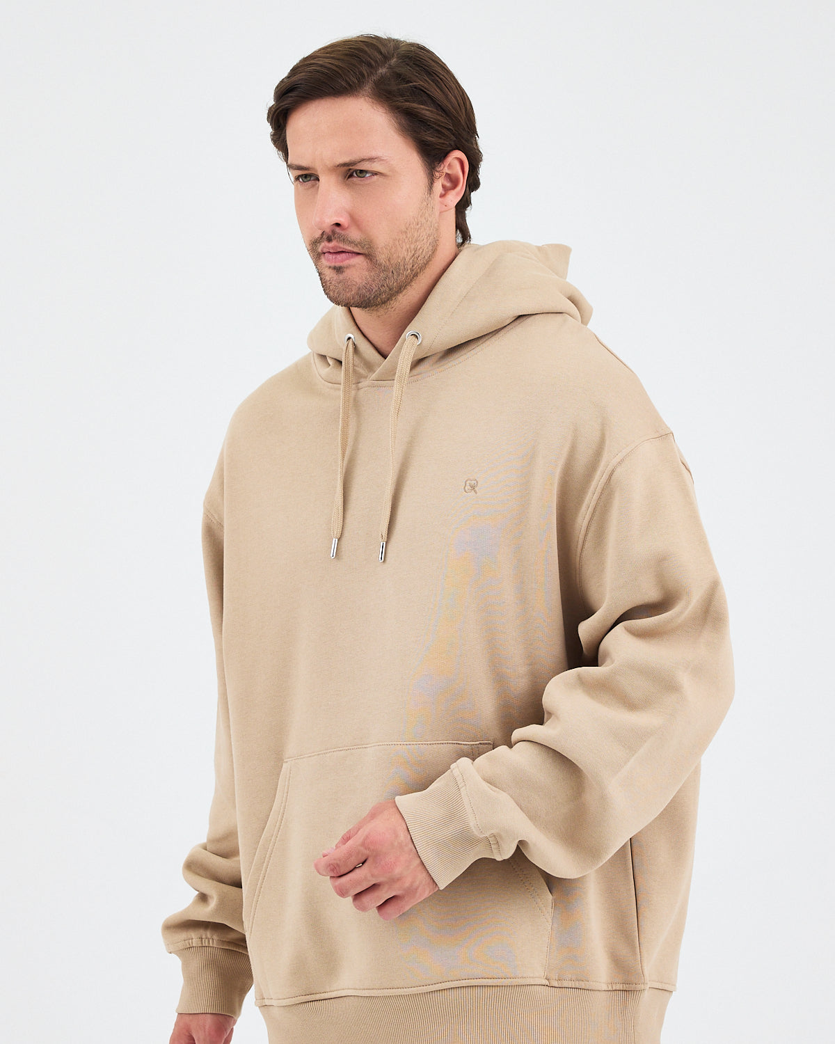 Bej renginin sofistike tonuyla tasarlanan bu unisex hoodie; oversize kesimi ve yumuşak dokulu iç yüzeyiyle konforu modern bir estetikle buluşturur. Göğüs bölümündeki bej rengine uyumlu ince tona ton logo nakış detayı, ürüne zarif ve minimal bir karakter kazandırır. Günlük stilinize sade ama etkili bir dokunuş eklemek isteyenler için ideal bir seçimdir.