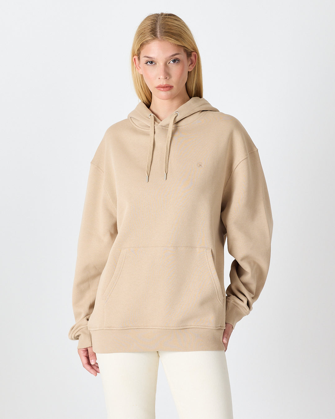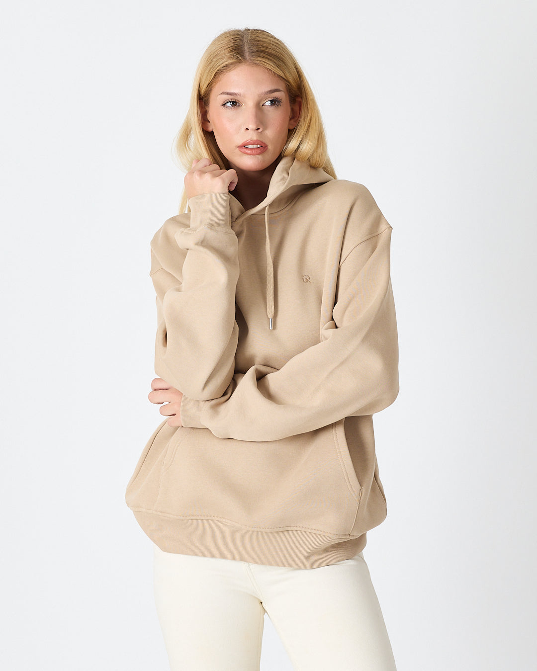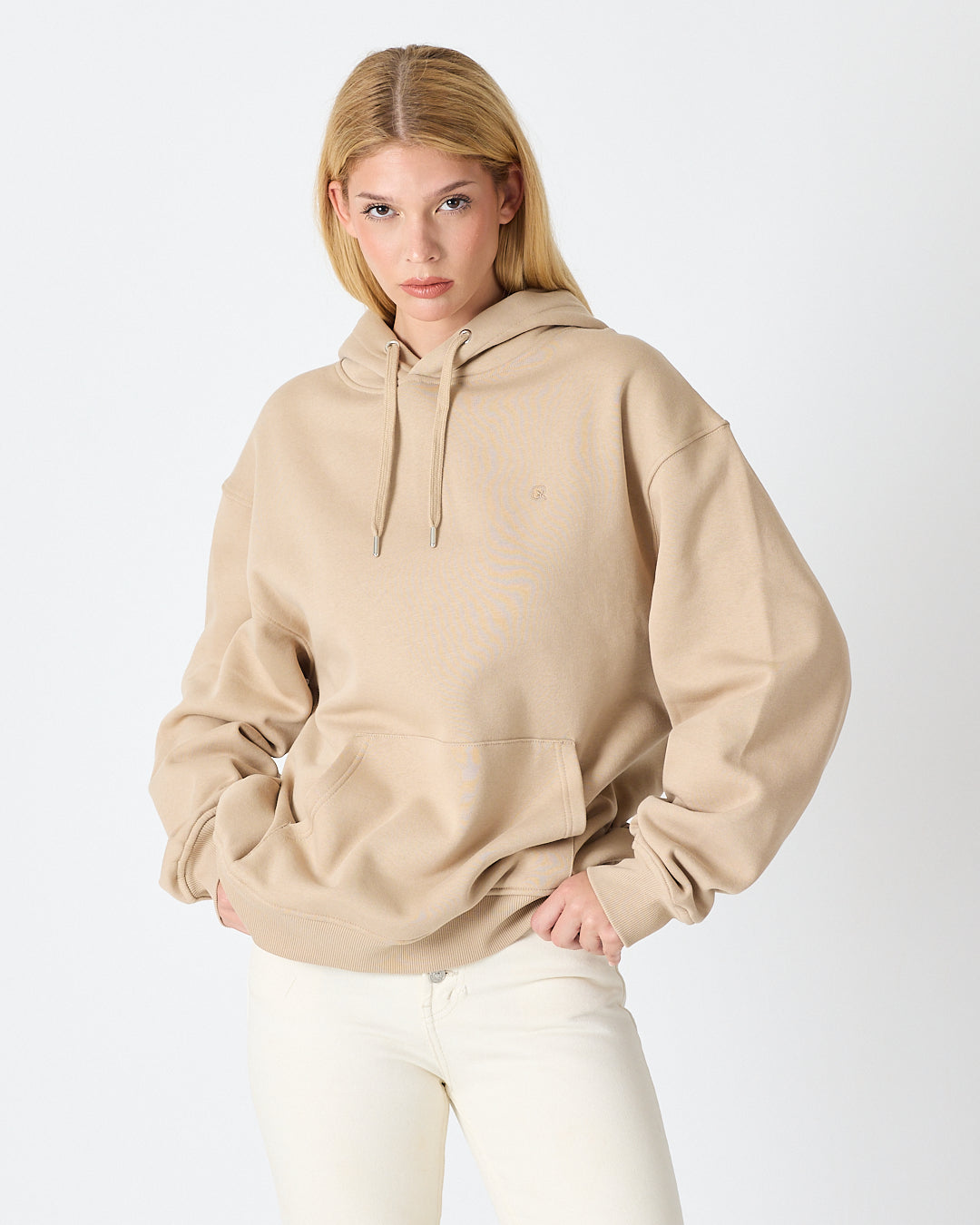 Bej renginin sofistike tonuyla tasarlanan bu unisex hoodie; oversize kesimi ve yumuşak dokulu iç yüzeyiyle konforu modern bir estetikle buluşturur. Göğüs bölümündeki bej rengine uyumlu ince tona ton logo nakış detayı, ürüne zarif ve minimal bir karakter kazandırır. Günlük stilinize sade ama etkili bir dokunuş eklemek isteyenler için ideal bir seçimdir.