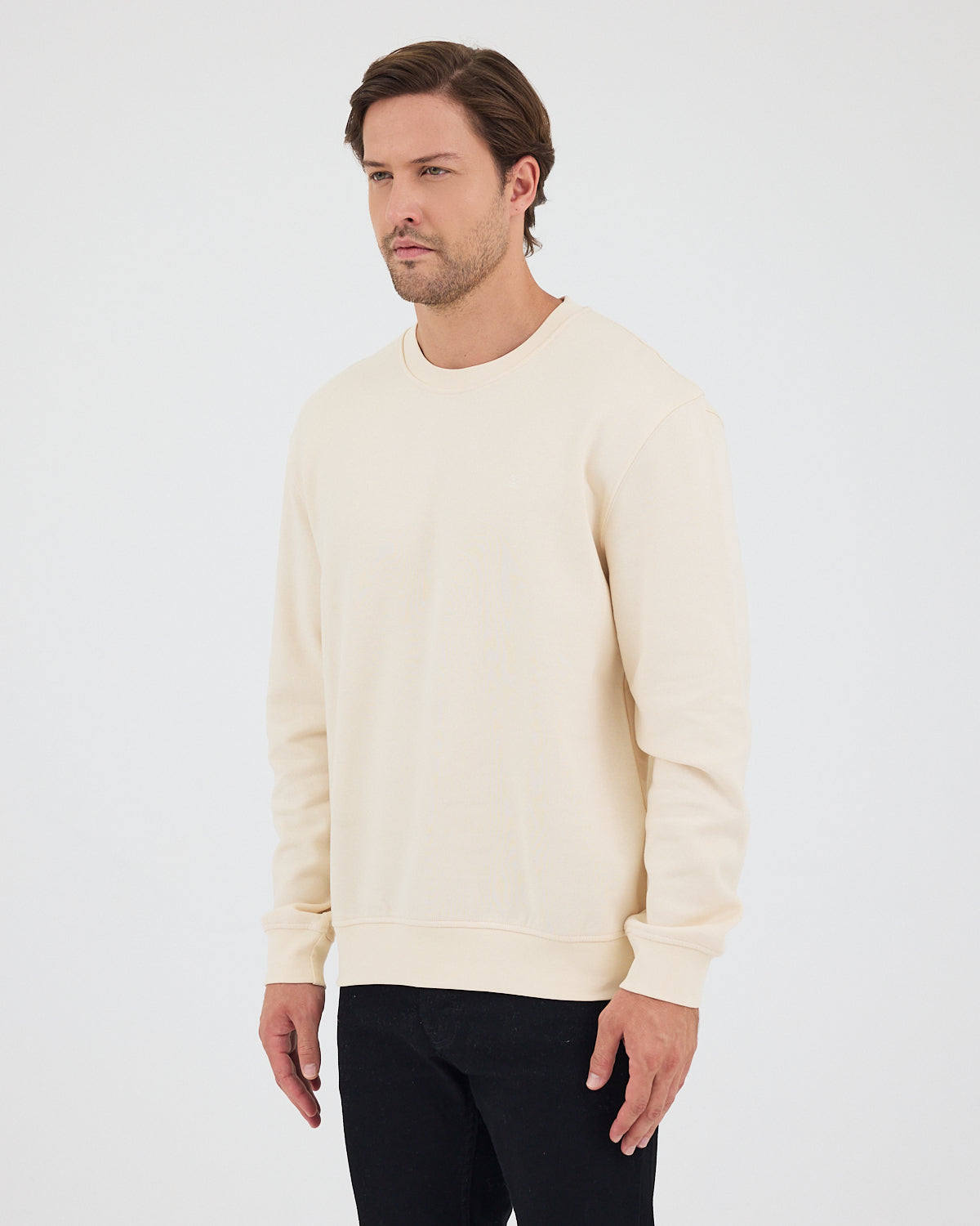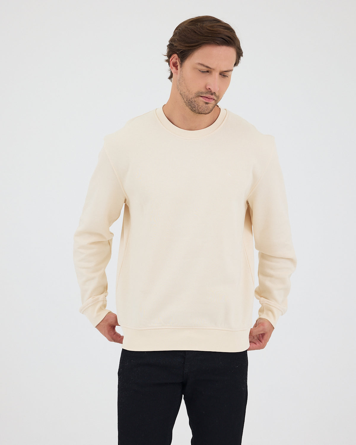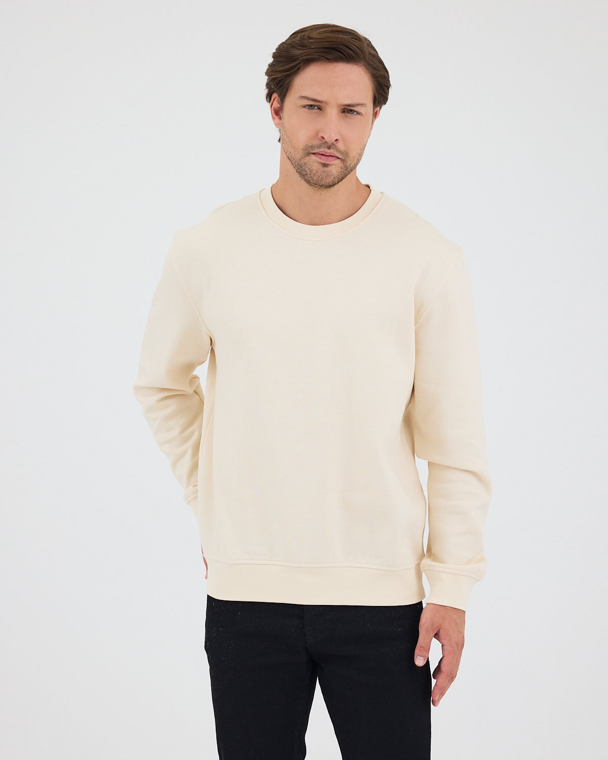 Ekru rengin doğal ve sade tonunu yumuşak dokulu pamuklu yapısıyla birleştiren bu sweatshirt; bisiklet yaka formu, standart kalıbı ve ekru tona ton logo nakış detayıyla hem modern hem de minimal bir görünüm sunar. Günlük kullanım için ideal olan model, hafif yapısı ve konforlu kesimi sayesinde her mevsimde rahatlıkla tercih edilebilir.